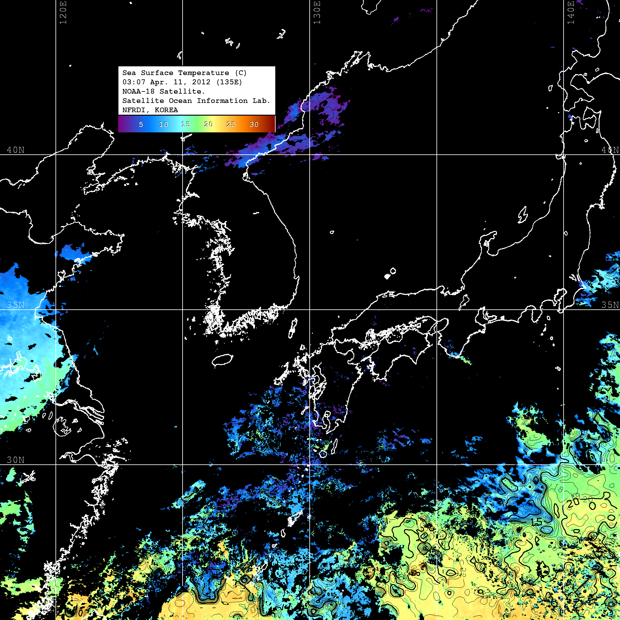 o 2012년 04월 11일 NOAA 위성영상입니다. o 영상 시간 및 수온분포는 범례를 참고하시기 바랍니다. o 검은색은 구름을 나타냅니다. o 그림을 클릭하시면 크게 보실 수 있습니다.