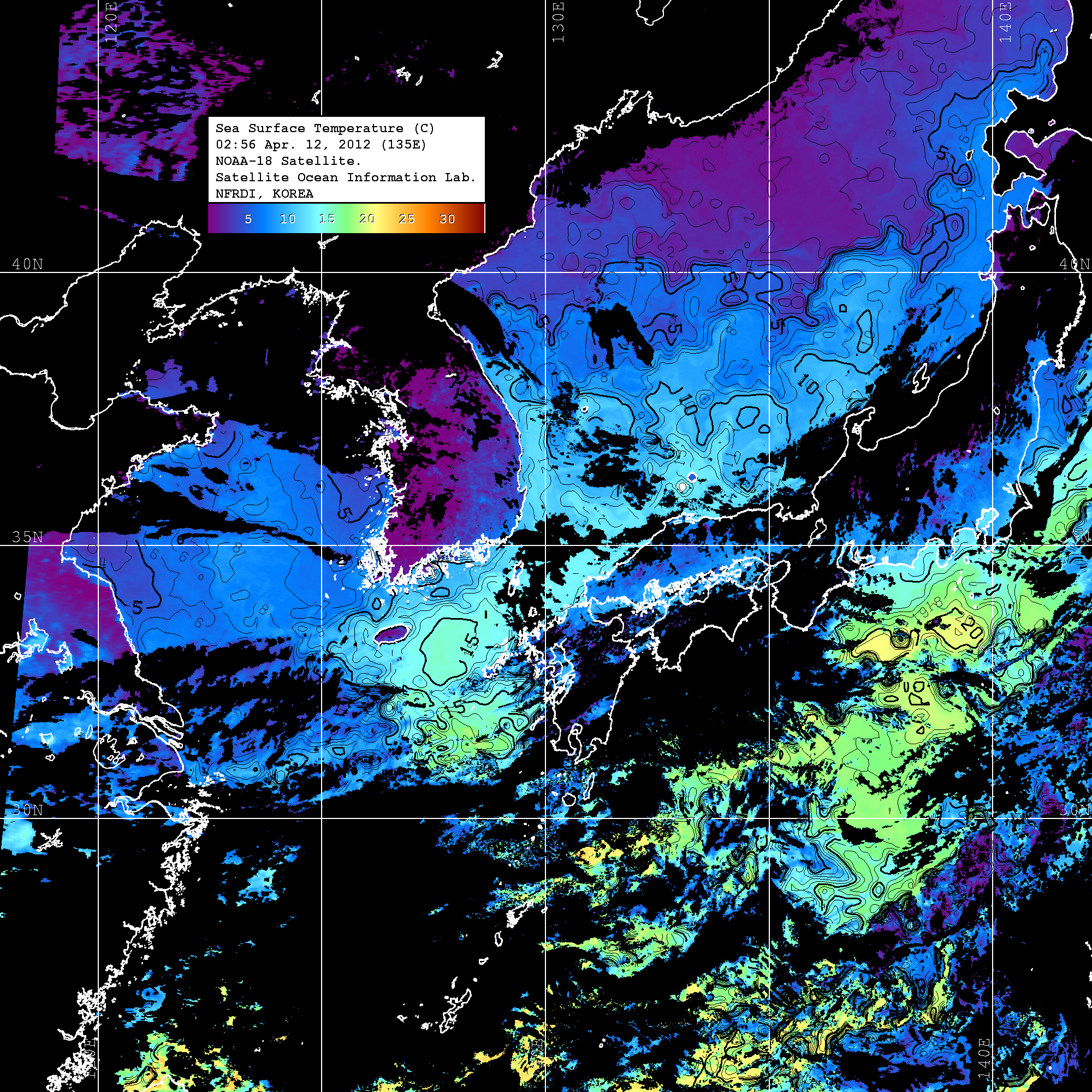 o 2012년 04월 12일 NOAA 위성영상입니다. o 영상 시간 및 수온분포는 범례를 참고하시기 바랍니다. o 검은색은 구름을 나타냅니다. o 그림을 클릭하시면 크게 보실 수 있습니다.