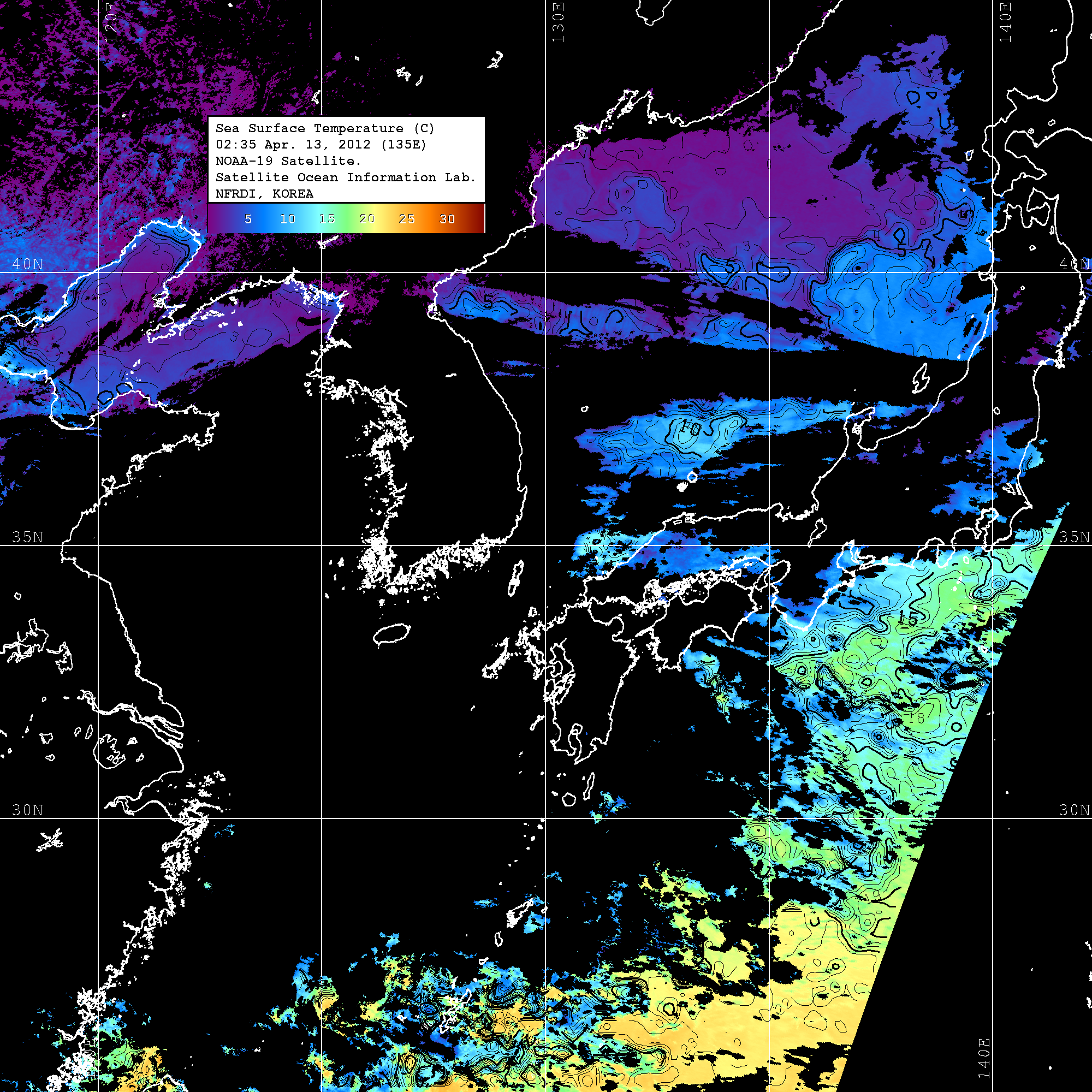 o 2012년 04월 13일 NOAA 위성영상입니다. o 영상 시간 및 수온분포는 범례를 참고하시기 바랍니다. o 검은색은 구름을 나타냅니다. o 그림을 클릭하시면 크게 보실 수 있습니다.