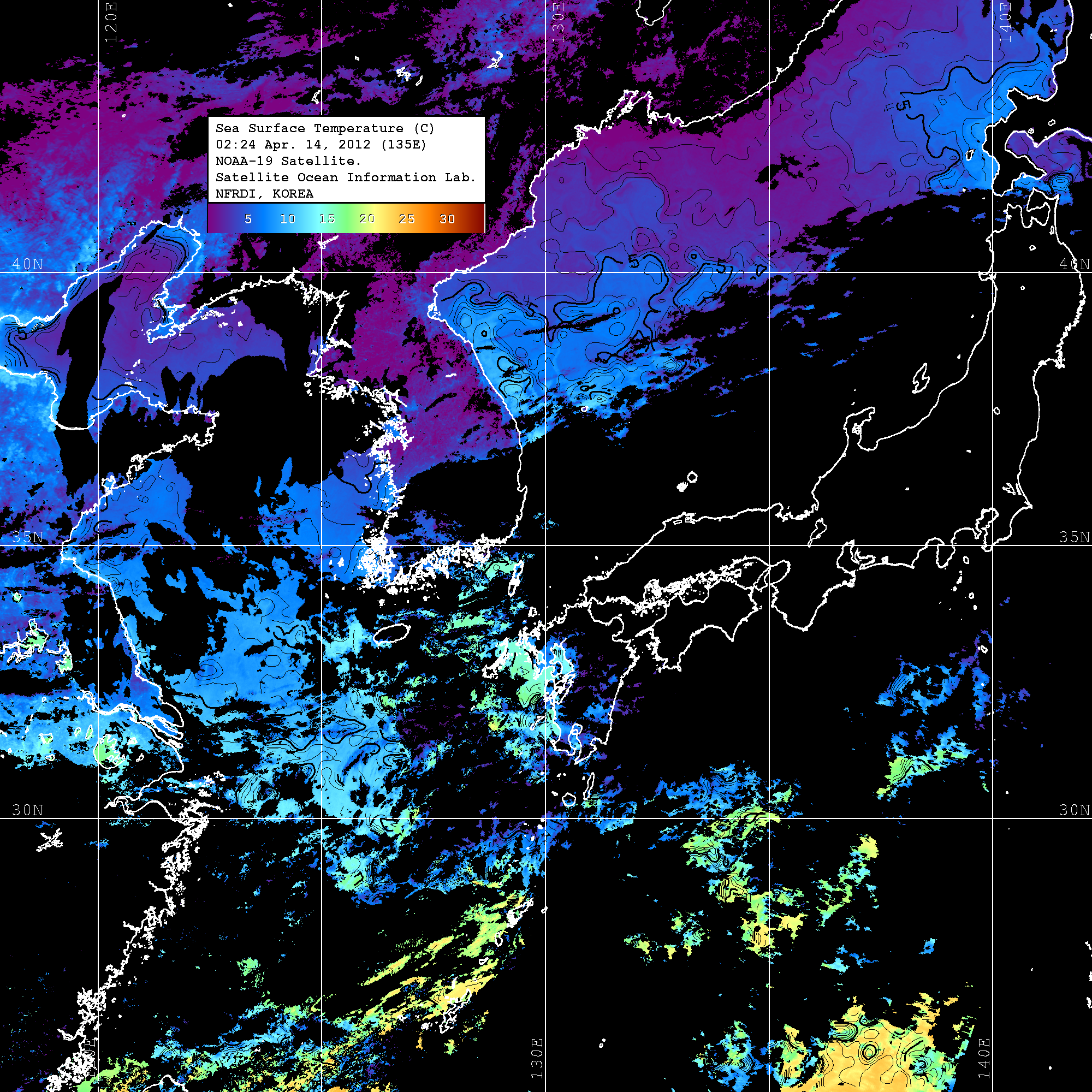 o 2012년 04월 14일 NOAA 위성영상입니다. o 영상 시간 및 수온분포는 범례를 참고하시기 바랍니다. o 검은색은 구름을 나타냅니다. o 그림을 클릭하시면 크게 보실 수 있습니다.