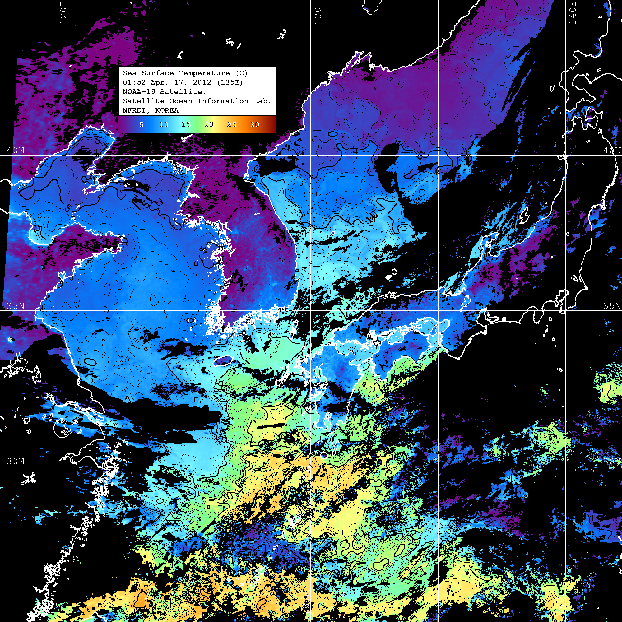 o 2012년 04월 17일 NOAA 위성영상입니다. o 영상 시간 및 수온분포는 범례를 참고하시기 바랍니다. o 검은색은 구름을 나타냅니다. o 그림을 클릭하시면 크게 보실 수 있습니다.