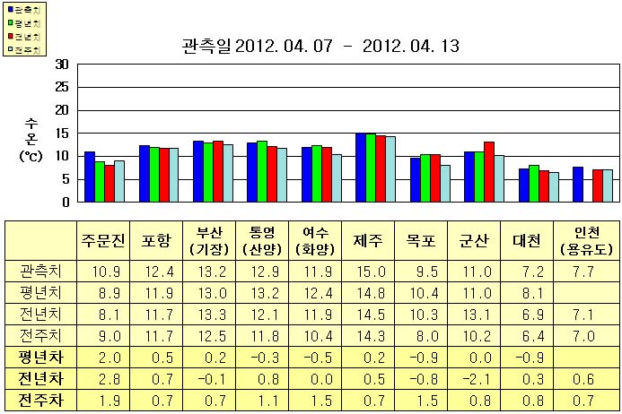 o 금주(2012.04.07~2012.04.13)의 한반도 연안 표면수온은 동해 연안역에서 섭씨 10.5~13.5도, 남해 연안역 11.5~15.0도, 서해 연안역에서 7~11도로 나타납니다. o 평년에 비해 부산(기장) 비슷함을 제외한 동해 연안역은 0.5~2.0도 높게, 제주 비슷함을 제외한 남해 연안역은 0.5도 낮게, 군산 비슷함을 제외한 서해 연안역은 0.5~1.0도 낮게 나타납니다. o 전년에 비해 부산(기장) 비슷함을 제외한 동해 연안역은 0.5~3.0도 높게, 여수(화양) 비슷함을 제외한 남해 연안역은 0.5∼1.0도 높게, 인천(용유도) 0.6도 높고, 대천 비슷함을 제외한 서해 연안역은 0.5~2.5도 낮게 나타납니다.