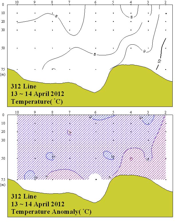 ㅇ 2012년 4월 13~14일 국립수산과학원 서해수산연구소에서 조사한 312선 (제주해협 서방)의 수직수온분포도 및 평년편차도입니다. ㅇ 관측해역 내에서 뚜렷한 수온약층은 형성되지 않았고, 8~10℃의 수온분포를 보였습니다. ㅇ 평년에 비하여 대부분의 해역에서 1~2℃의 저온현상을 나타내었습니다.