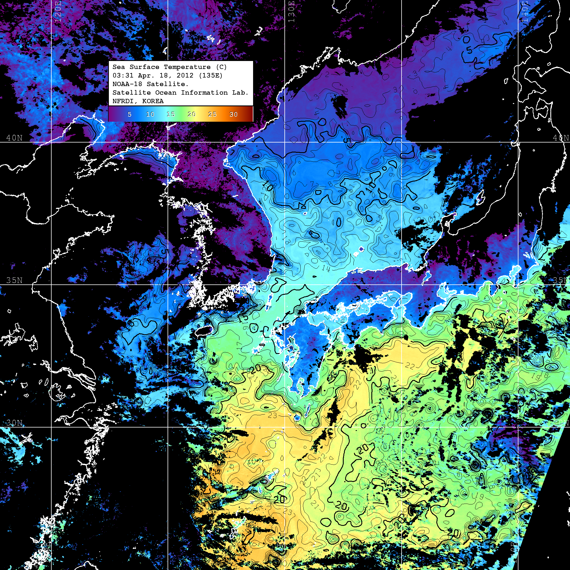o 2012년 04월 18일 NOAA 위성영상입니다. o 영상 시간 및 수온분포는 범례를 참고하시기 바랍니다. o 검은색은 구름을 나타냅니다. o 그림을 클릭하시면 크게 보실 수 있습니다.