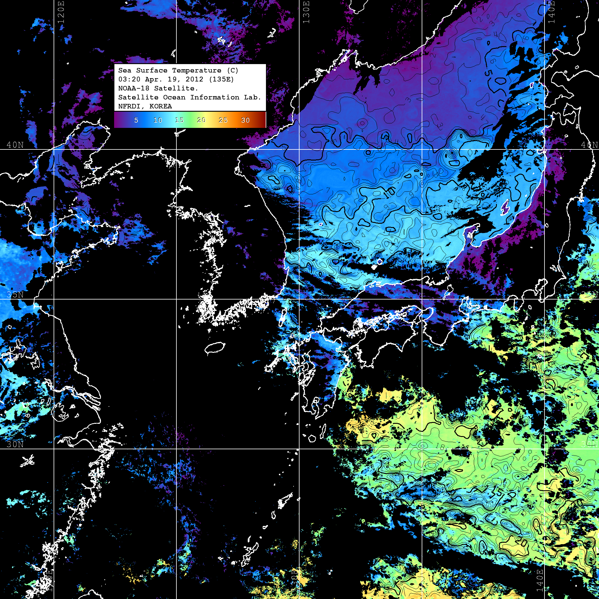 o 2012년 04월 19일 NOAA 위성영상입니다. o 영상 시간 및 수온분포는 범례를 참고하시기 바랍니다. o 검은색은 구름을 나타냅니다. o 그림을 클릭하시면 크게 보실 수 있습니다.