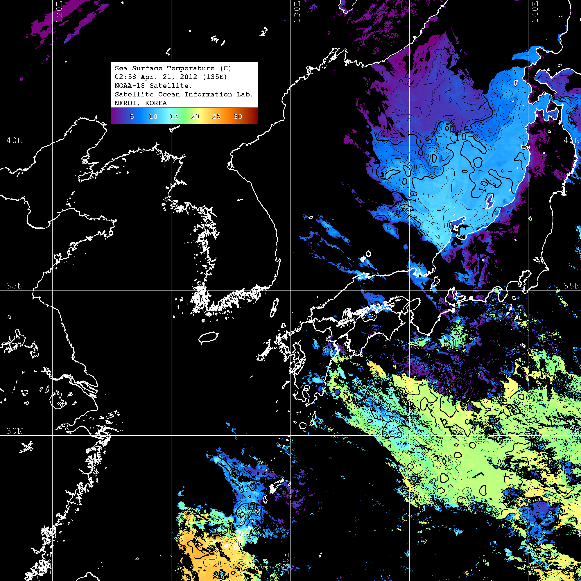 o 2012년 04월 21일 NOAA 위성영상입니다. o 영상 시간 및 수온분포는 범례를 참고하시기 바랍니다. o 검은색은 구름을 나타냅니다. o 그림을 클릭하시면 크게 보실 수 있습니다.