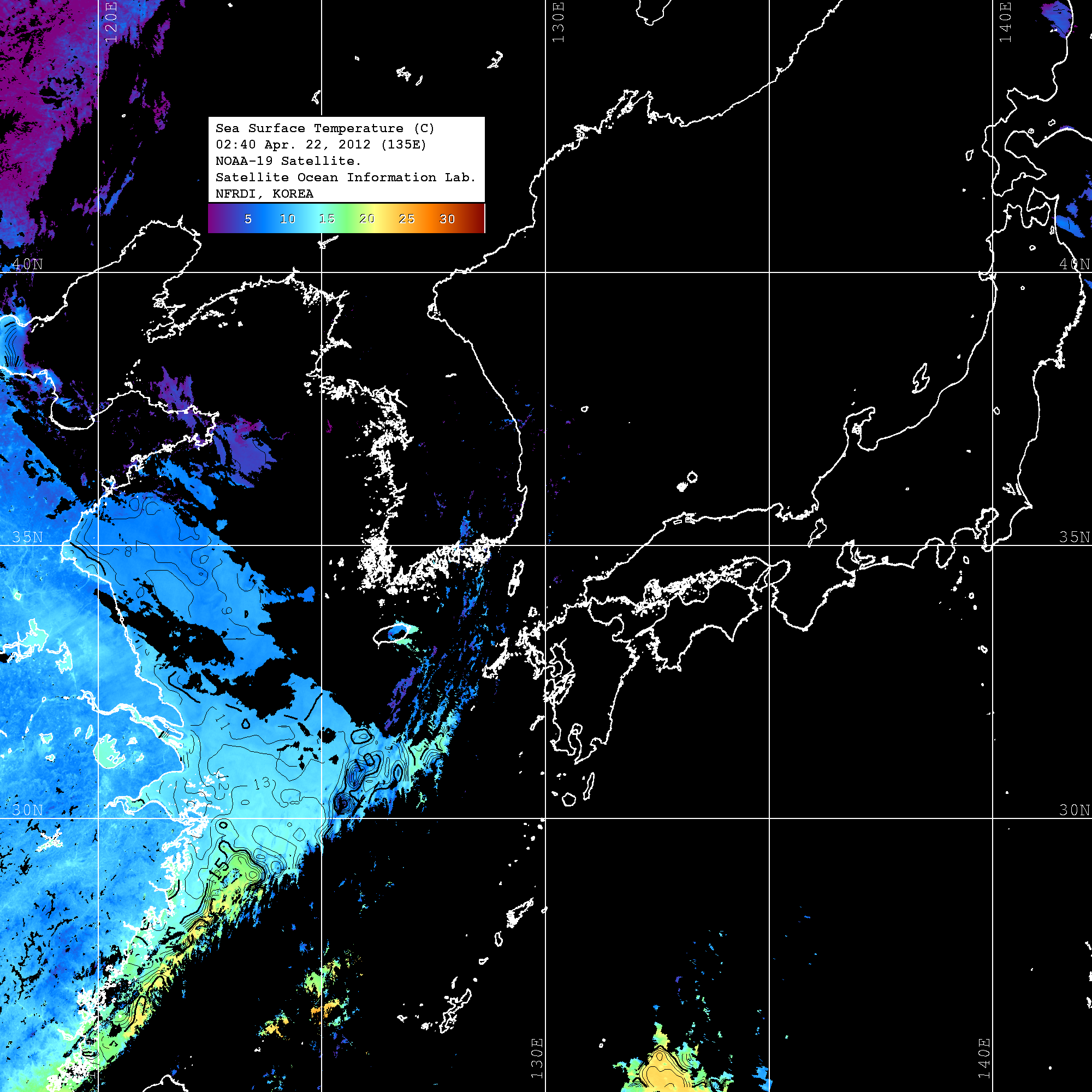 o 2012년 04월 22일 NOAA 위성영상입니다. o 영상 시간 및 수온분포는 범례를 참고하시기 바랍니다. o 검은색은 구름을 나타냅니다. o 그림을 클릭하시면 크게 보실 수 있습니다.