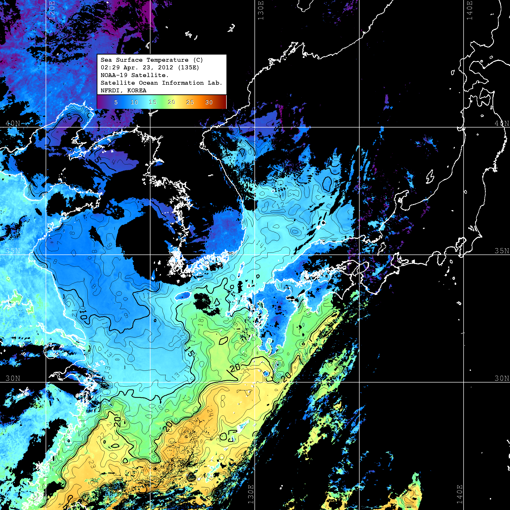 o 2012년 04월 23일 NOAA 위성영상입니다. o 영상 시간 및 수온분포는 범례를 참고하시기 바랍니다. o 검은색은 구름을 나타냅니다. o 그림을 클릭하시면 크게 보실 수 있습니다.