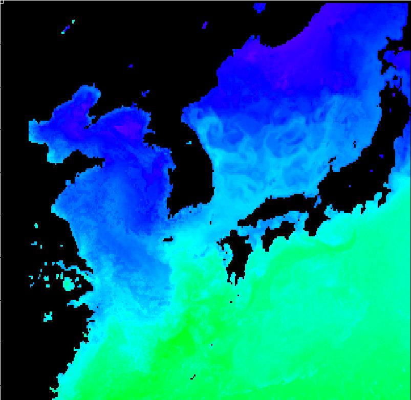 국립수산과학원 위성해양정보실에서 연구중인 2012년 4월 23일 구름이 배제된 위성 수온 영상입니다 |