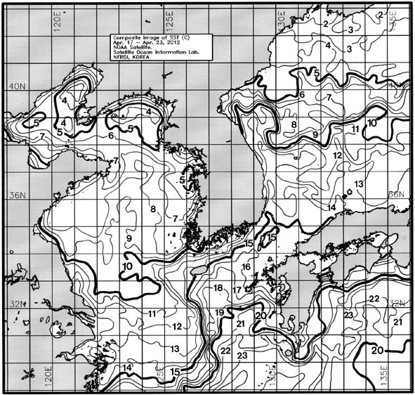 o 금주(2012.04.17~2012.04.23)의 한국근해 표면수온은 대화퇴 근해 7~8도, 울릉도 근해 12~13도, 대마도 근해 15~16도, 제주도 근해 14~16도, 이어도 근해 10~11도, 가거초 근해 8~9도, 어청도 근해 5~6도로 나타납니다. o「평년에 비해」대화퇴 근해 0.7도 낮게, 울릉도 근해 1.6도 높게, 대마도 근해 비슷하게, 제주도 근해 비슷하게, 이어도 근해 비슷하게, 가거초 근해 2도 낮게, 어청도 근해는 1.4도 낮게 나타납니다. o「전년에 비해」대화퇴 근해 비슷하게, 울릉도 근해 2.5도 높게, 대마도 근해 0.5도 높게, 제주도 근해 0.5도 높게, 이어도 근해 비슷하게, 가거초 근해 2.5도 낮게, 어청도 근해는 1.5도 낮게 나타납니다. o 수온 전선대는 우리나라 제주해협에서 대한해협까지 13도를 중심으로 형성됩니다.
