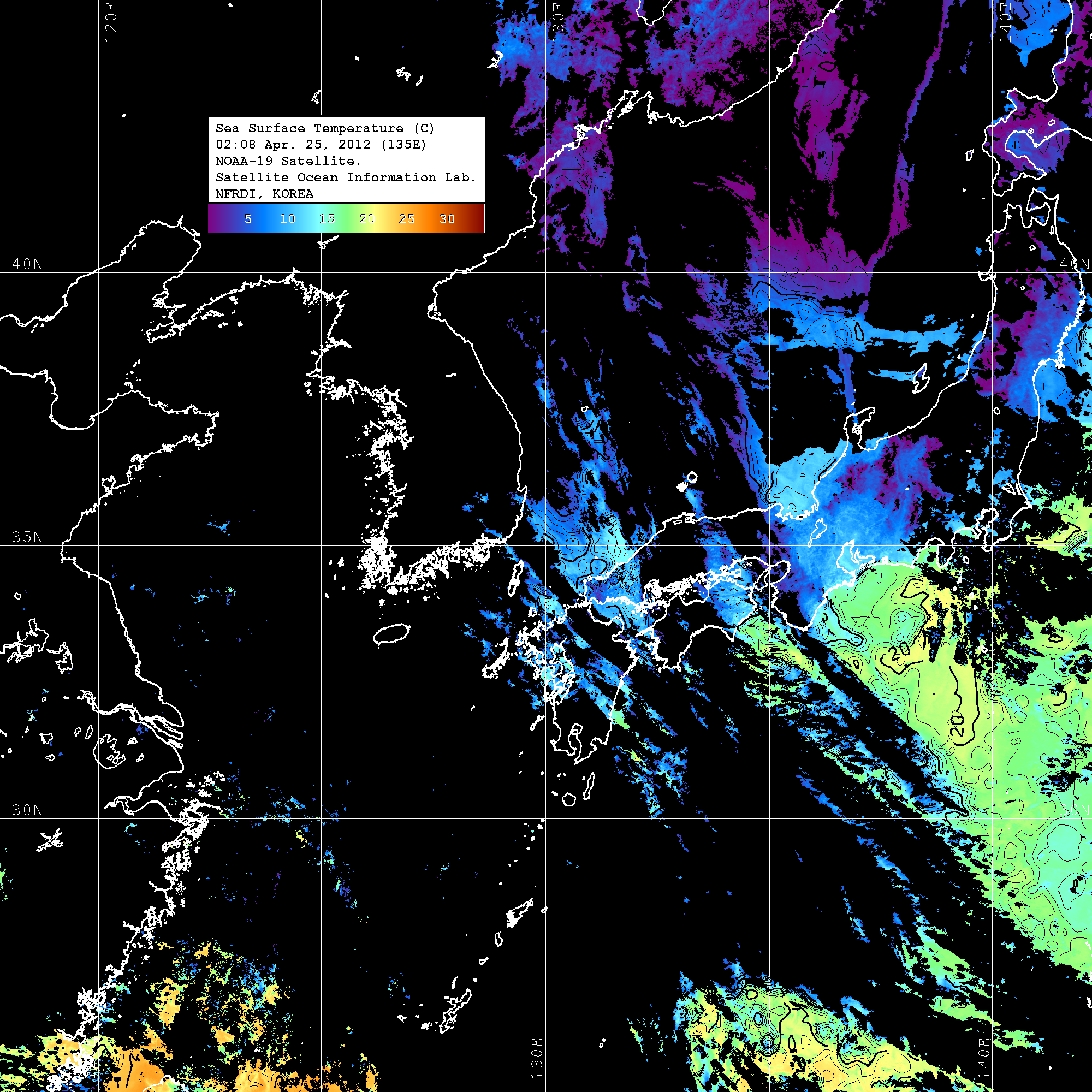 o 2012년 04월 25일 NOAA 위성영상입니다. o 영상 시간 및 수온분포는 범례를 참고하시기 바랍니다. o 검은색은 구름을 나타냅니다. o 그림을 클릭하시면 크게 보실 수 있습니다.