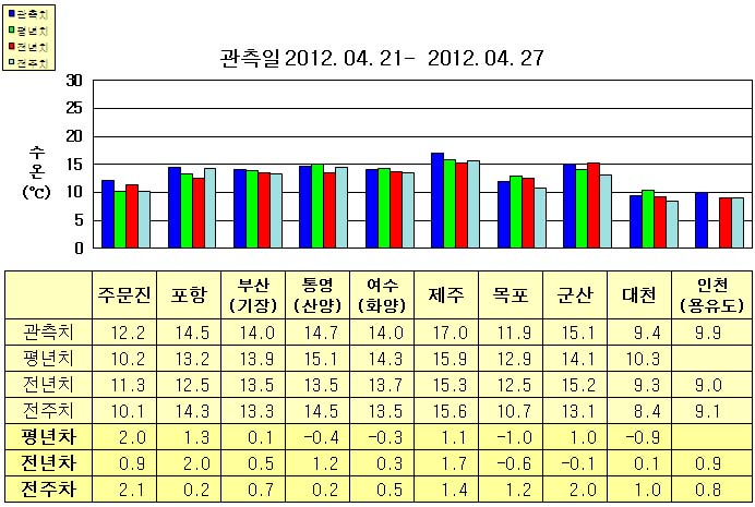 o 금주(2012.04.21~2012.04.27)의 한반도 연안 표면수온은 동해 연안역에서 섭씨 12.0~14.5도, 남해 연안역 14~17도, 서해 연안역에서 9.0~15.5도로 나타납니다. o 평년에 비해 부산(기장) 비슷함을 제외한 동해 연안역은 1~2도 높게, 제주 1.1도 높음을 제외한 남해 연안역은 0.5도 낮게, 군산 1도 높음 제외한 서해 연안역은 0.5~1.0도 낮게 나타납니다. o 전년에 비해 동해 연안역은 0.5~2.0도 높게, 여수(화양) 비슷함을 제외한 남해 연안역은 1∼2도 높게, 인천(용유도) 0.9도 높고, 목포 0.6도 낮음을 제외한 서해 연안역은 비슷하게 나타납니다.