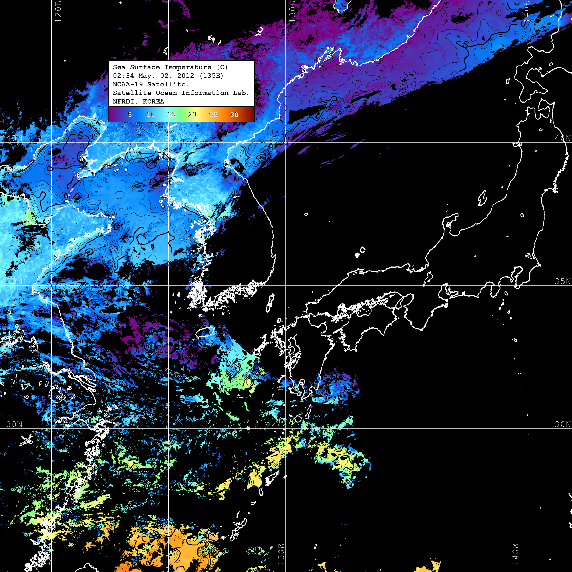 o 2012년 05월 02일 NOAA 위성영상입니다. o 영상 시간 및 수온분포는 범례를 참고하시기 바랍니다. o 검은색은 구름을 나타냅니다. o 그림을 클릭하시면 크게 보실 수 있습니다.