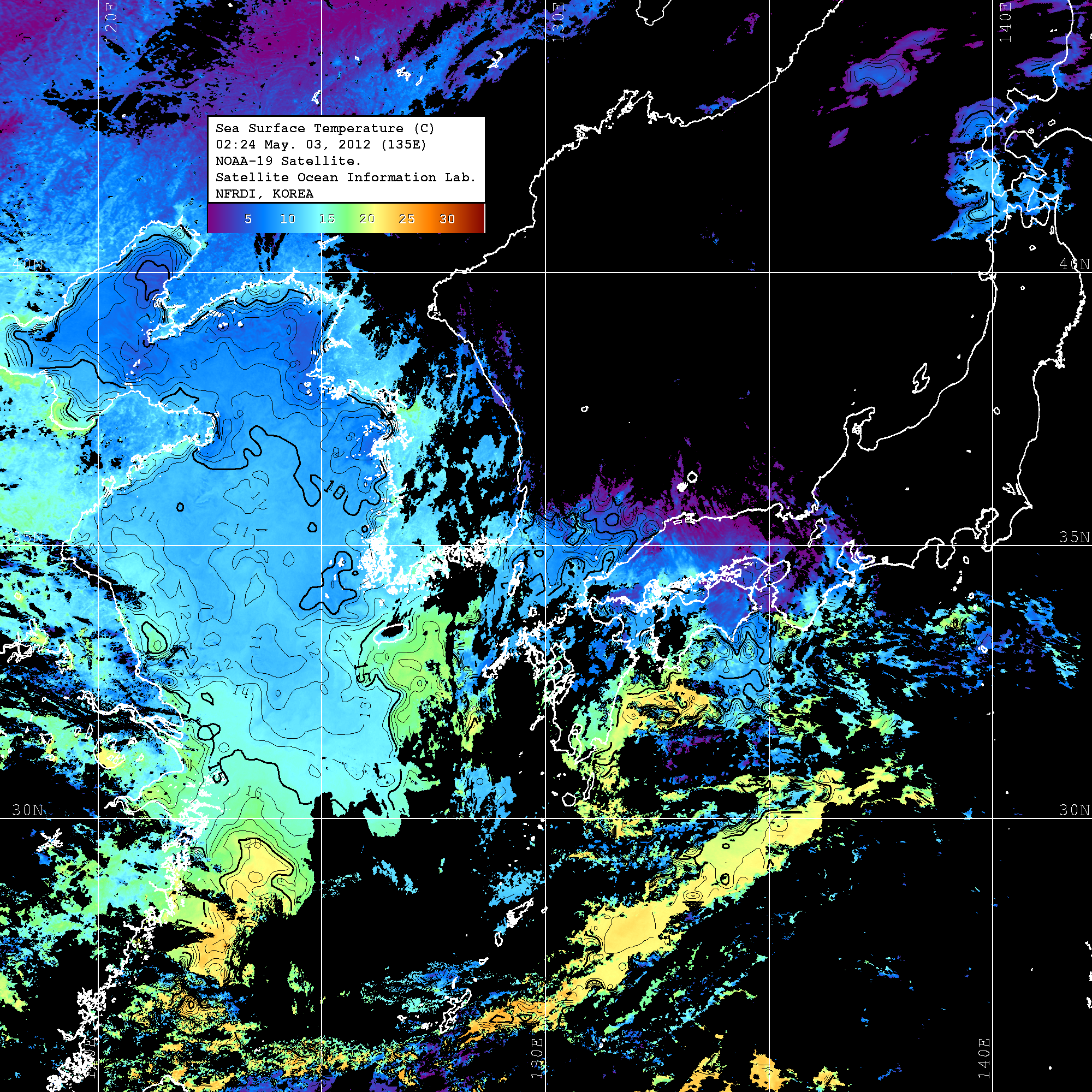 o 2012년 05월 03일 NOAA 위성영상입니다. o 영상 시간 및 수온분포는 범례를 참고하시기 바랍니다. o 검은색은 구름을 나타냅니다. o 그림을 클릭하시면 크게 보실 수 있습니다.