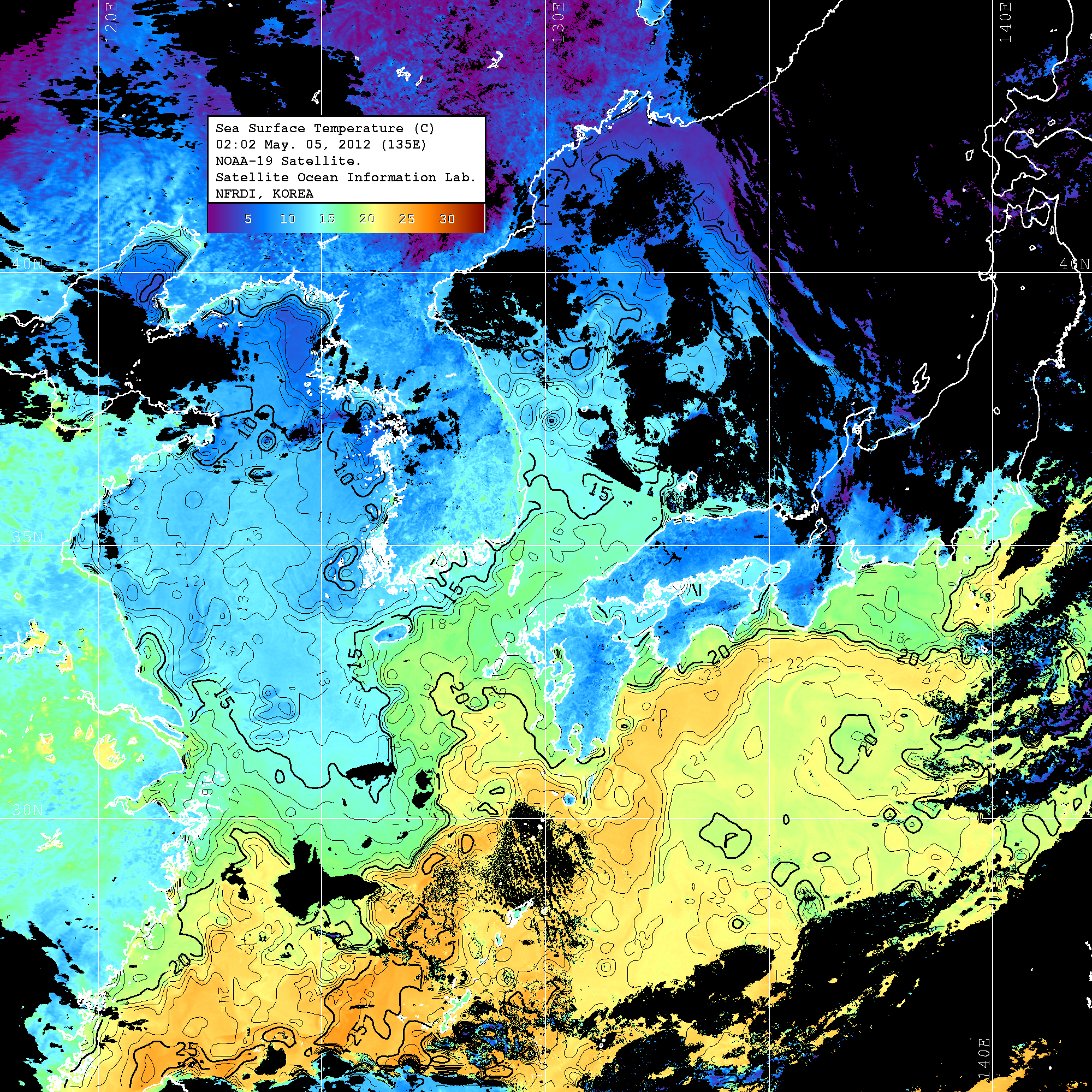 o 2012년 05월 05일 NOAA 위성영상입니다. o 영상 시간 및 수온분포는 범례를 참고하시기 바랍니다. o 검은색은 구름을 나타냅니다. o 그림을 클릭하시면 크게 보실 수 있습니다.