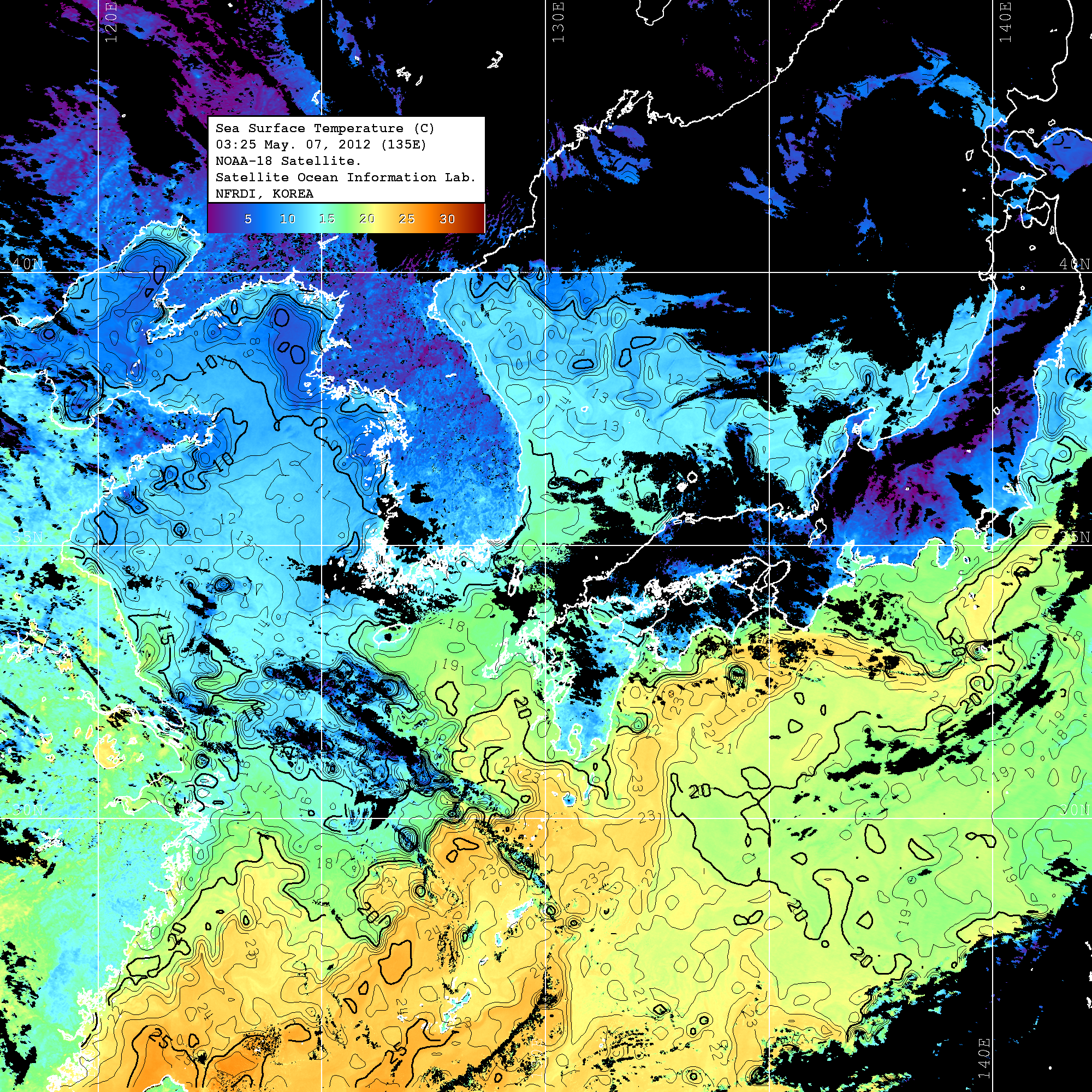 o 2012년 05월 07일 NOAA 위성영상입니다. o 영상 시간 및 수온분포는 범례를 참고하시기 바랍니다. o 검은색은 구름을 나타냅니다. o 그림을 클릭하시면 크게 보실 수 있습니다.