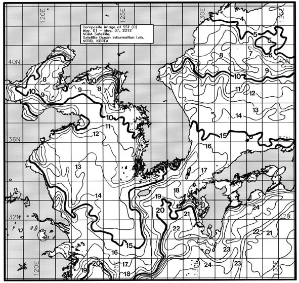 o 금주(2012.05.01~2012.05.07)의 한국근해 표면수온은 대화퇴 근해 9~10도, 울릉도 근해 13~14도, 대마도 근해 16~17도, 제주도 근해 16~17도, 이어도 근해 13~14도, 가거초 근해 11~12도, 어청도 근해 10~11도로 나타납니다. o「평년에 비해」대화퇴 근해 1.3도 낮게, 울릉도 근해 0.4도 높게, 대마도 근해 0.6도 높게, 제주도 근해 1.6도 높게, 이어도 근해 비슷하게, 가거초 근해 0.7도 낮게, 어청도 근해는 1.5도 높게 나타납니다. o「전년에 비해」대화퇴 근해 2.5도 높게, 울릉도 근해 3.5도 높게, 대마도 근해 1.5도 높게, 제주도 근해 1.5도 높게, 이어도 근해 비슷하게, 가거초 근해 1도 낮게, 어청도 근해는 1.5도 높게 나타납니다. o 수온 전선대는 우리나라 제주해협에서 대한해협까지 15도를 중심으로 형성됩니다.