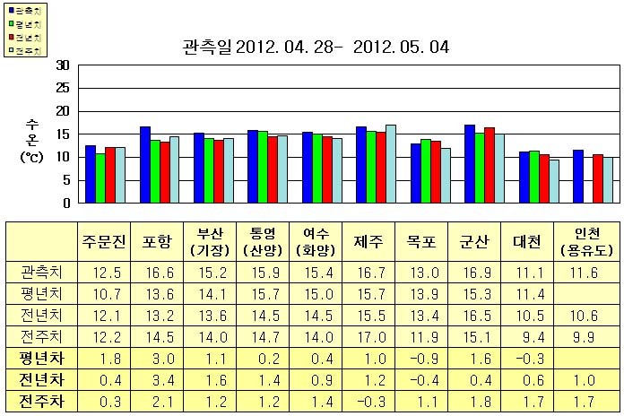 o 금주(2012.04.28~2012.05.04)의 한반도 연안 표면수온은 동해 연안역에서 섭씨 12.5~17.0도, 남해 연안역 15~17도, 서해 연안역에서 11~17도로 나타납니다. o 평년에 비해 동해 연안역은 1~3도 높게, 통영(산양) 비슷함을 제외한 남해 연안역은 0.5∼1.0도 높게, 군산 1.6도 높음 제외한 서해 연안역은 0.5~1.0도 낮게 나타납니다. o 전년에 비해 동해 연안역은 0.5~3.5도 높게, 남해 연안역은 0.5∼1.5도 높게, 목포 0.4도 낮음을 제외한 서해 연안역은 0.5∼1.0도 높게 나타납니다.