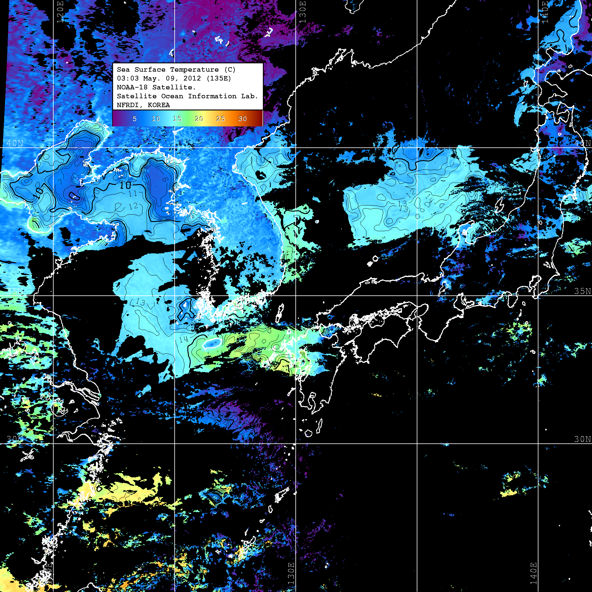 o 2012년 05월 09일 NOAA 위성영상입니다. o 영상 시간 및 수온분포는 범례를 참고하시기 바랍니다. o 검은색은 구름을 나타냅니다. o 그림을 클릭하시면 크게 보실 수 있습니다.