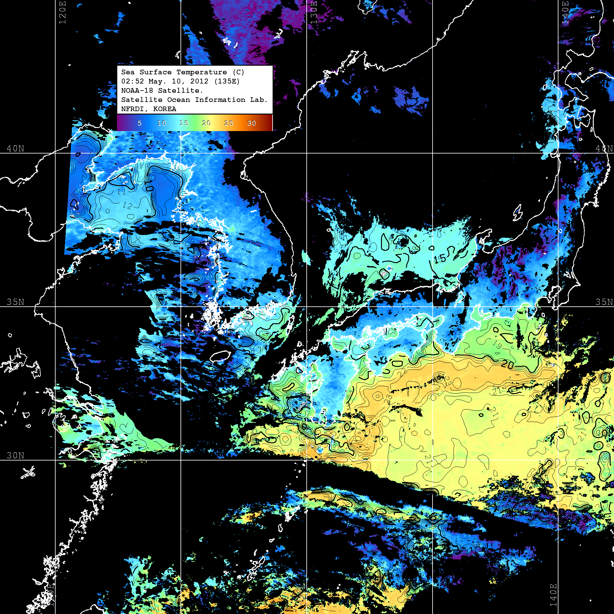 o 2012년 05월 10일 NOAA 위성영상입니다. o 영상 시간 및 수온분포는 범례를 참고하시기 바랍니다. o 검은색은 구름을 나타냅니다. o 그림을 클릭하시면 크게 보실 수 있습니다.