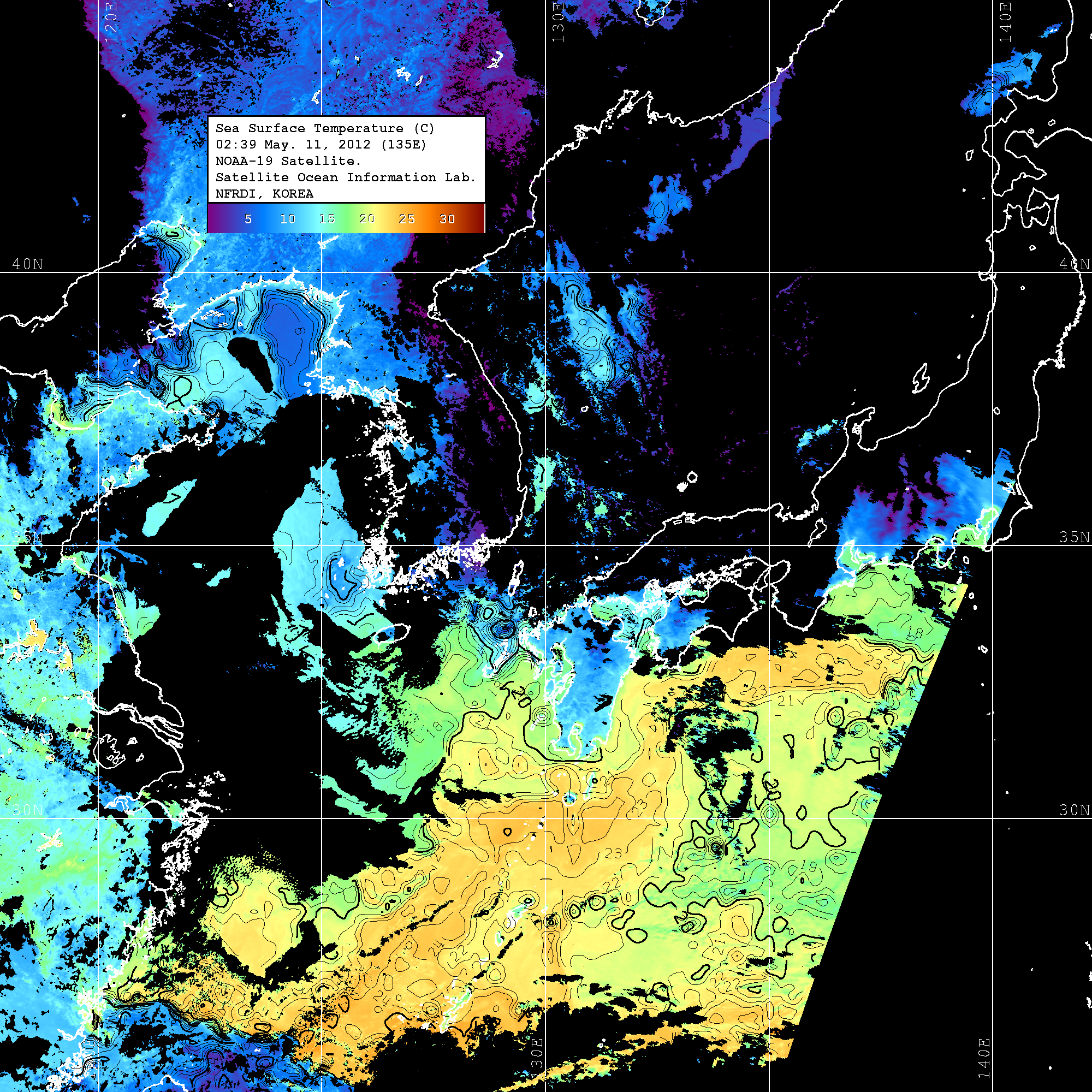 o 2012년 05월 11일 NOAA 위성영상입니다. o 영상 시간 및 수온분포는 범례를 참고하시기 바랍니다. o 검은색은 구름을 나타냅니다. o 그림을 클릭하시면 크게 보실 수 있습니다.