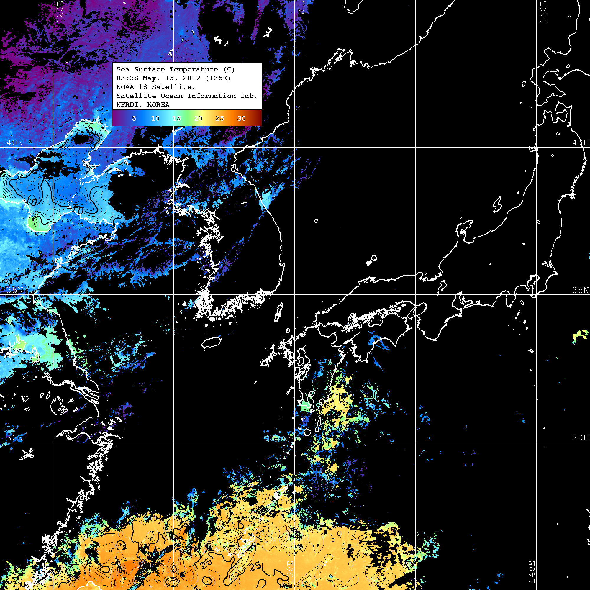 o 2012년 05월 15일 NOAA 위성영상입니다. o 영상 시간 및 수온분포는 범례를 참고하시기 바랍니다. o 검은색은 구름을 나타냅니다. o 그림을 클릭하시면 크게 보실 수 있습니다.
