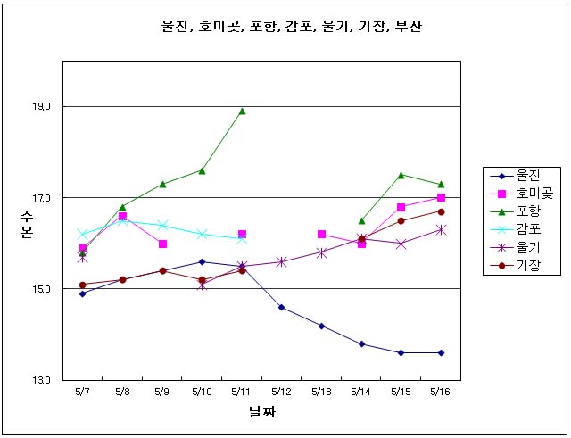 o 아래 그림은 2012년 05월 07일∼5월 16일까지의 매일 오전 10시에 관측된 현장 표면수온 분포입니다. o 금일(16일) 오전 10시 현재 연안 관측 표면수온은 호미곶 17도, 포항 17.3도, 울기 16.3도, 부산(기장)은 16.7도로 나타납니다. o 그러나 울진의 표면수온은 5월 11일(15.5도)이후 낮아져 16일 현재 13.6도를 보이니, 수온변화에 각별한 주의가 필요합니다.