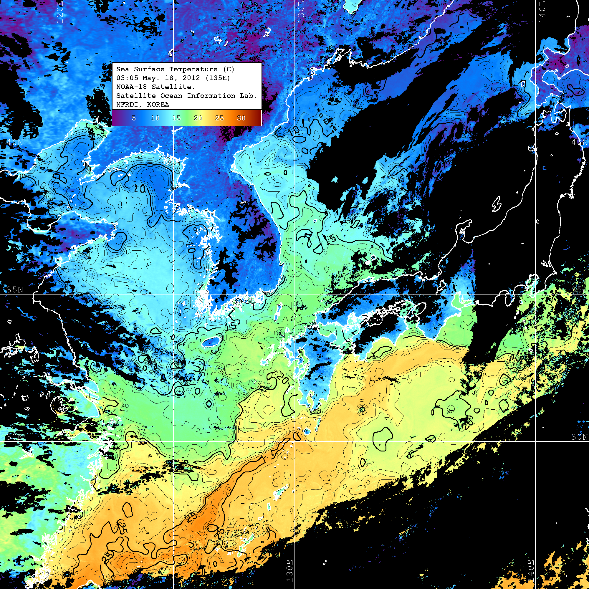o 2012년 05월 18일 NOAA 위성영상입니다. o 영상 시간 및 수온분포는 범례를 참고하시기 바랍니다. o 검은색은 구름을 나타냅니다. o 그림을 클릭하시면 크게 보실 수 있습니다.
