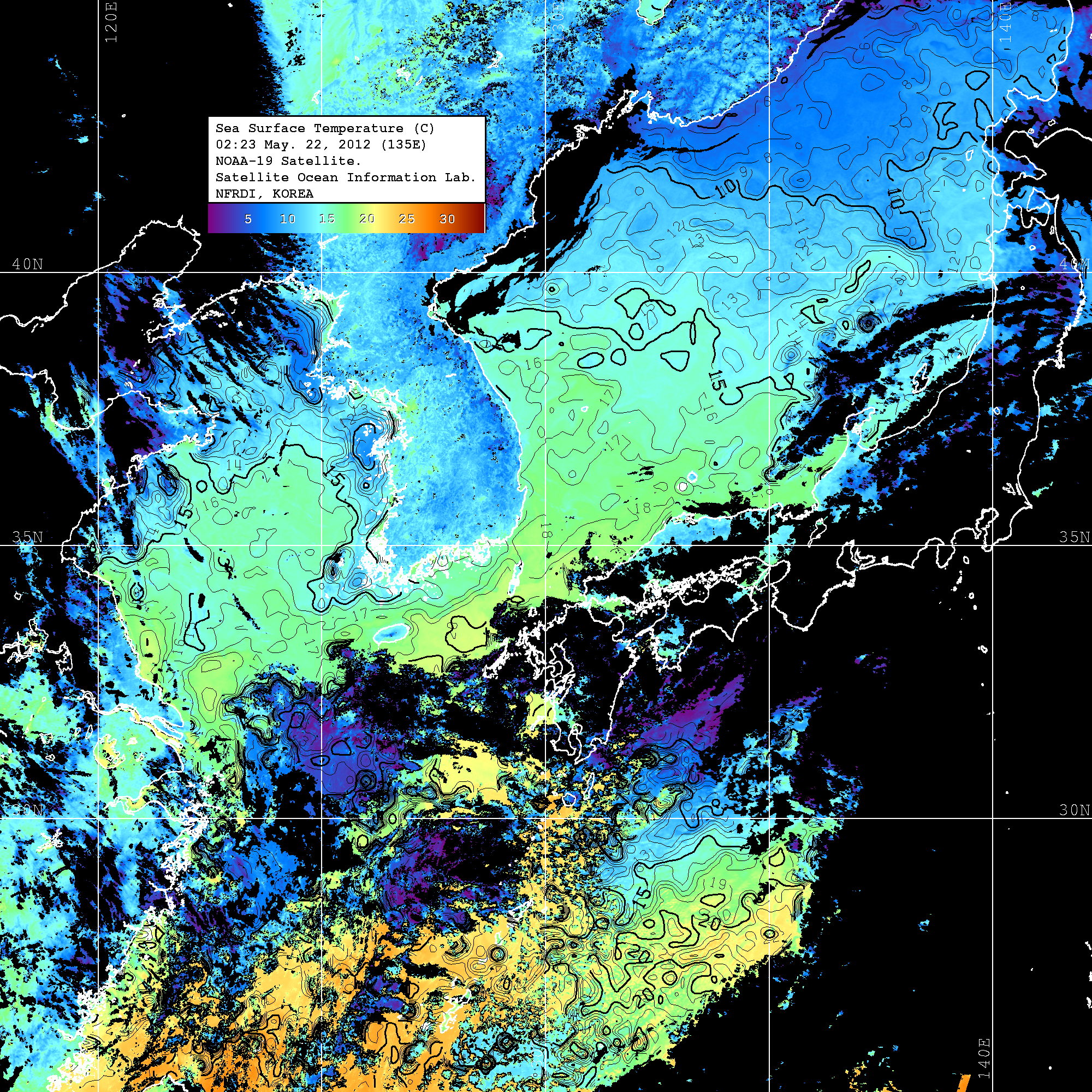 o 2012년 05월 22일 NOAA 위성영상입니다. o 영상 시간 및 수온분포는 범례를 참고하시기 바랍니다. o 검은색은 구름을 나타냅니다. o 그림을 클릭하시면 크게 보실 수 있습니다.