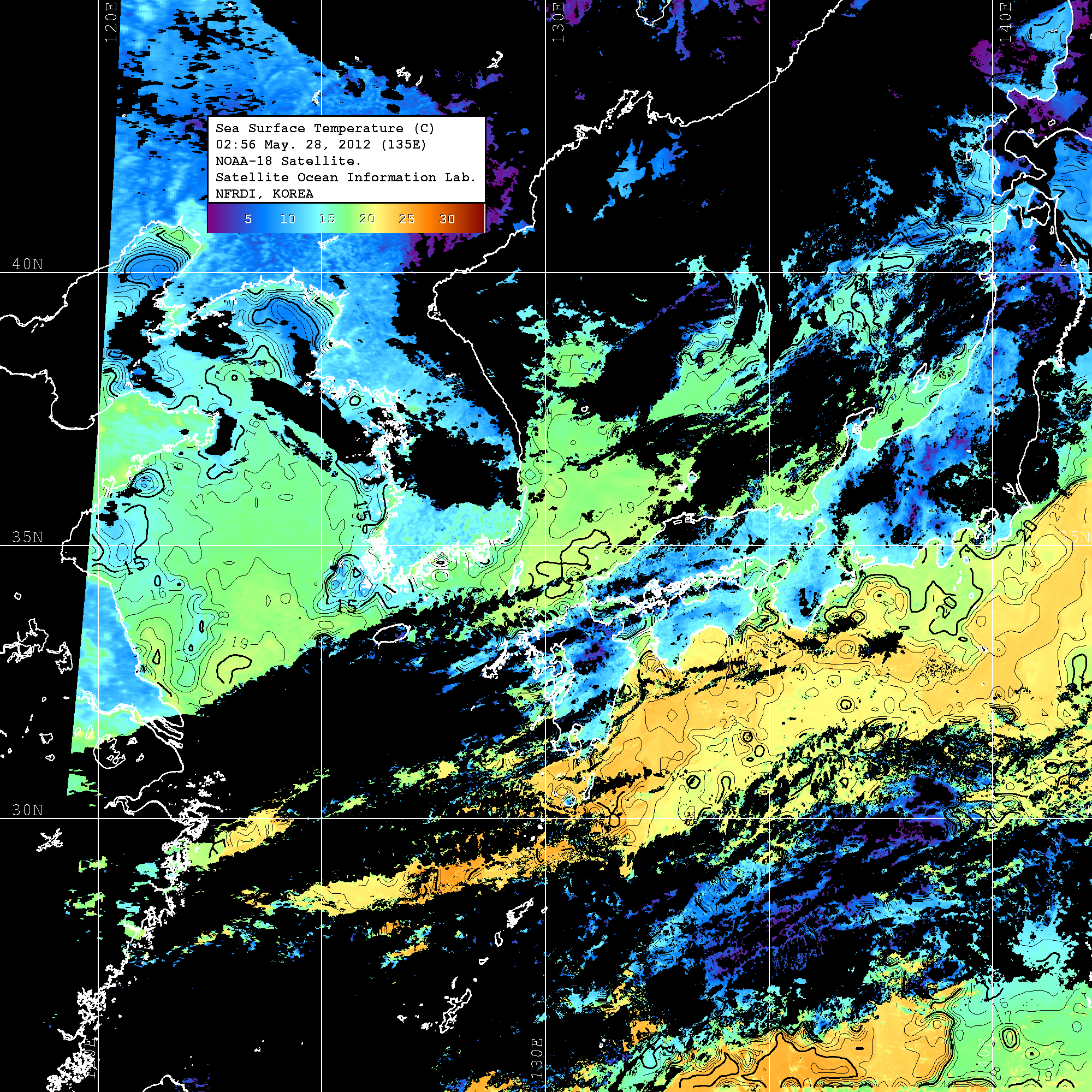 o 2012년 05월 28일 NOAA 위성영상입니다. o 영상 시간 및 수온분포는 범례를 참고하시기 바랍니다. o 검은색은 구름을 나타냅니다. o 그림을 클릭하시면 크게 보실 수 있습니다.