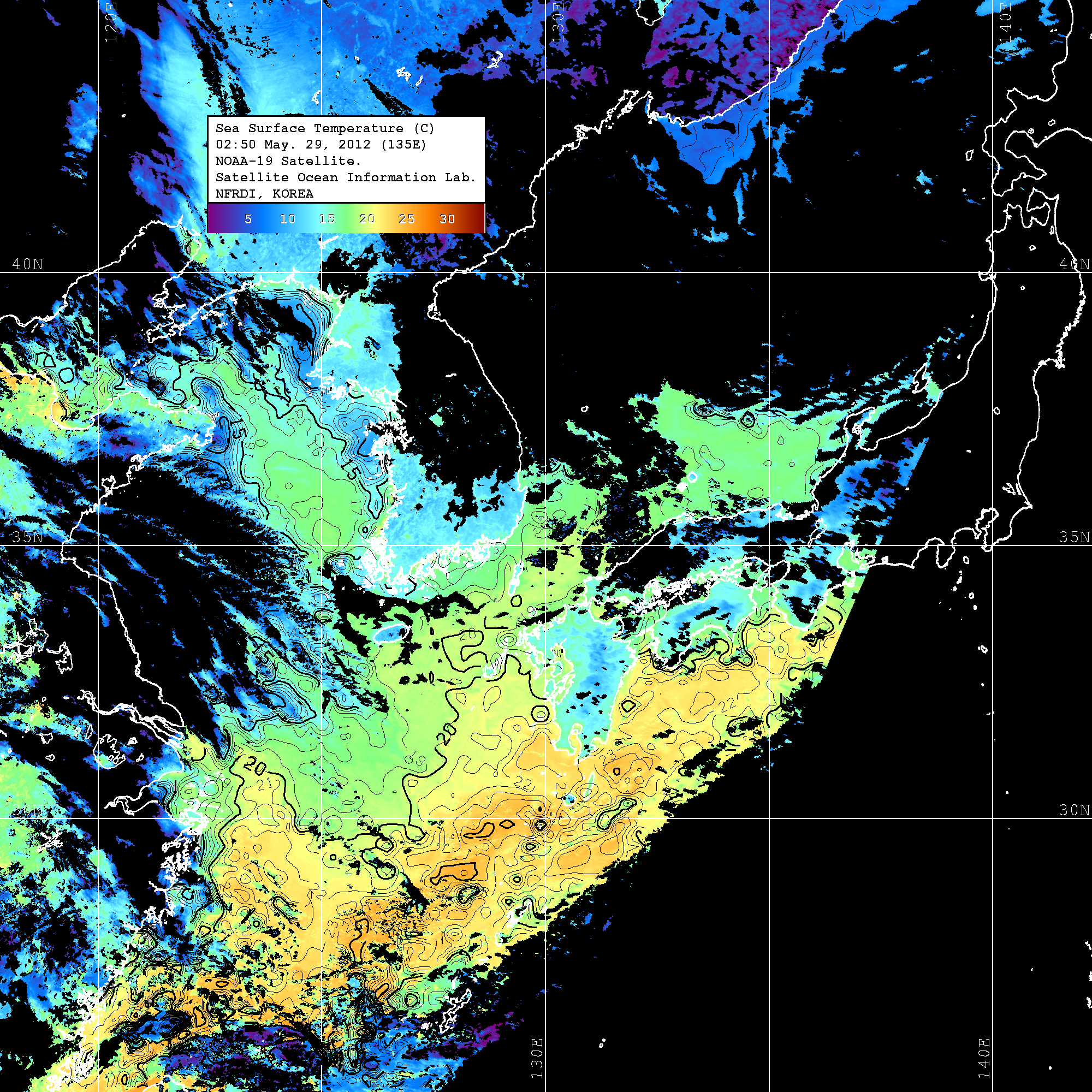 o 2012년 05월 29일 NOAA 위성영상입니다. o 영상 시간 및 수온분포는 범례를 참고하시기 바랍니다. o 검은색은 구름을 나타냅니다. o 그림을 클릭하시면 크게 보실 수 있습니다.