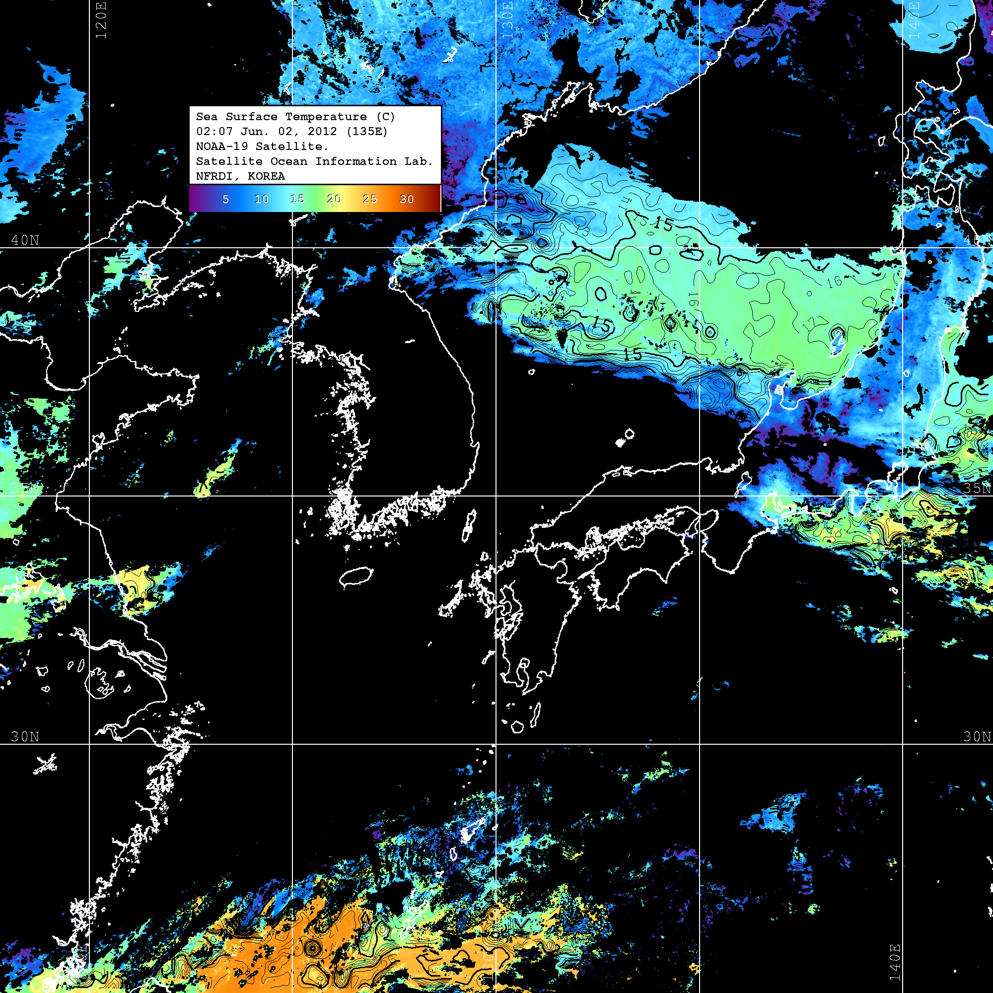 o 2012년 06월 02일 NOAA 위성영상입니다. o 영상 시간 및 수온분포는 범례를 참고하시기 바랍니다. o 검은색은 구름을 나타냅니다. o 그림을 클릭하시면 크게 보실 수 있습니다.
