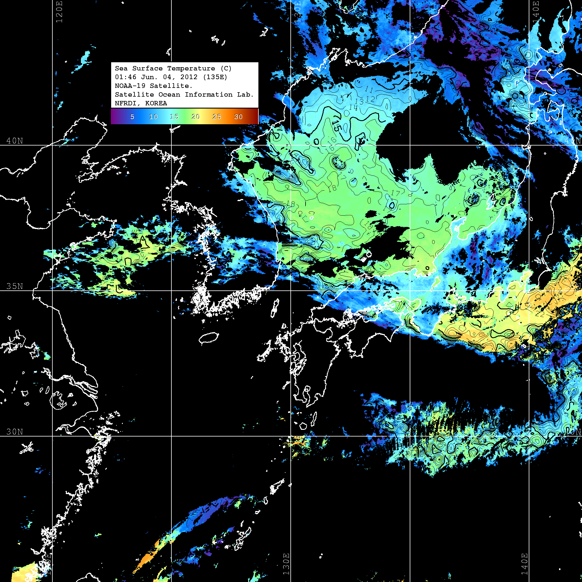 o 2012년 06월 04일 NOAA 위성영상입니다. o 영상 시간 및 수온분포는 범례를 참고하시기 바랍니다. o 검은색은 구름을 나타냅니다. o 그림을 클릭하시면 크게 보실 수 있습니다.