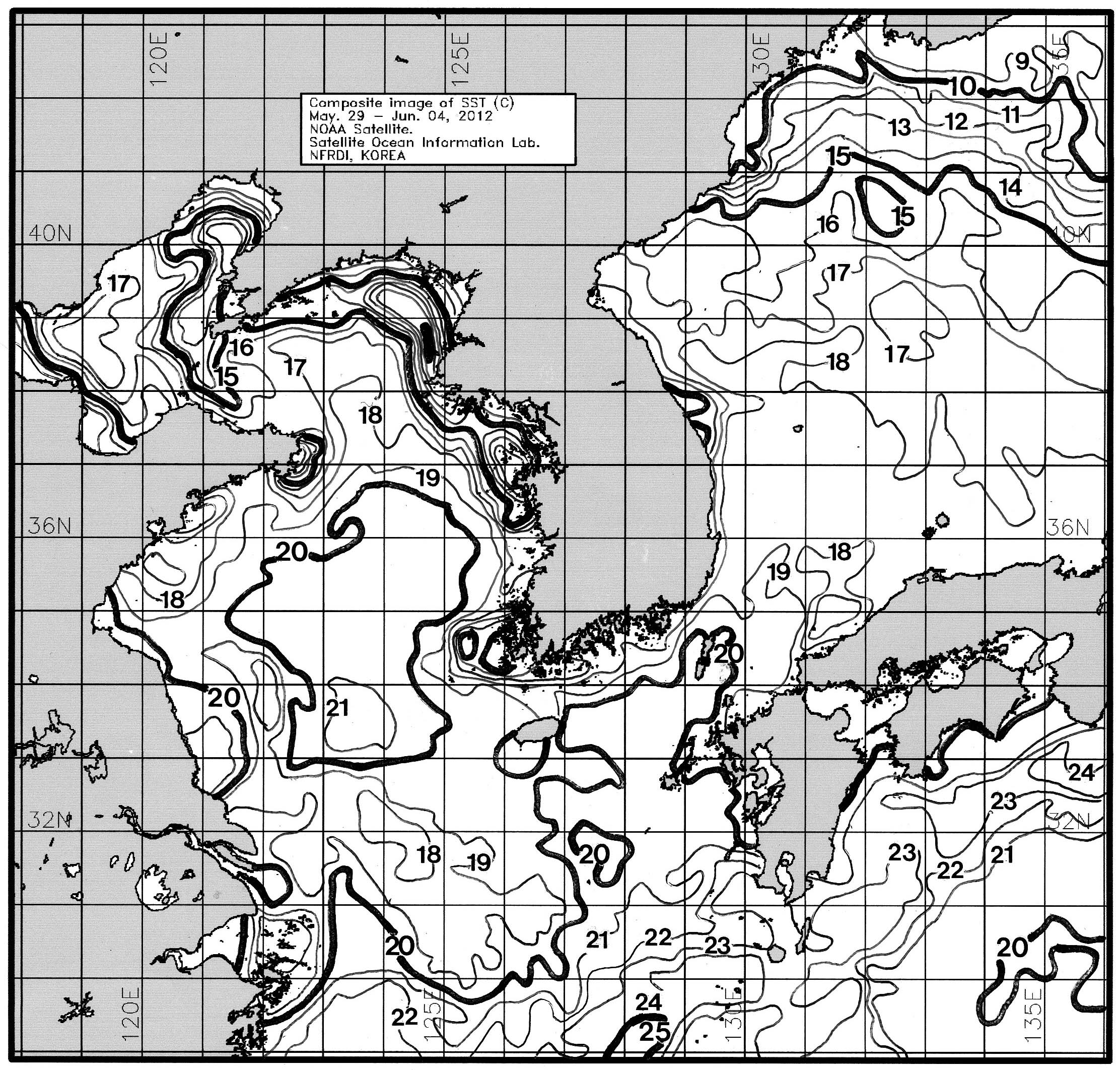 o 금주(2012.05.29~2012.06.04)의 한국근해 표면수온은 대화퇴 근해 16~17도, 울릉도 근해 18~19도, 대마도 근해 19~20도, 제주도 근해 19~20도, 이어도 근해 18~19도, 가거초 근해 18~19도, 어청도 근해 17~18도로 나타납니다. o「평년에 비해」대화퇴 근해 0.8도 높게, 울릉도 근해 0.7도 높게, 대마도 근해 0.6도 높게, 제주도 근해 0.4도 높게, 이어도 근해 비슷하게, 가거초 근해 1.8도 높게, 어청도 근해는 1.6도 높게 나타납니다. o「전년에 비해」대화퇴 근해 3도 높게, 울릉도 근해 2도 높게, 대마도 근해 1.5도 높게, 제주도 근해 0.5도 높게, 이어도 근해 0.5도 높게, 가거초 근해 1.5도 높게, 어청도 근해는 2.5도 높게 나타납니다. o 수온 전선대는 우리나라 제주해협에서 대한해협까지 18도를 중심으로 형성됩니다.
