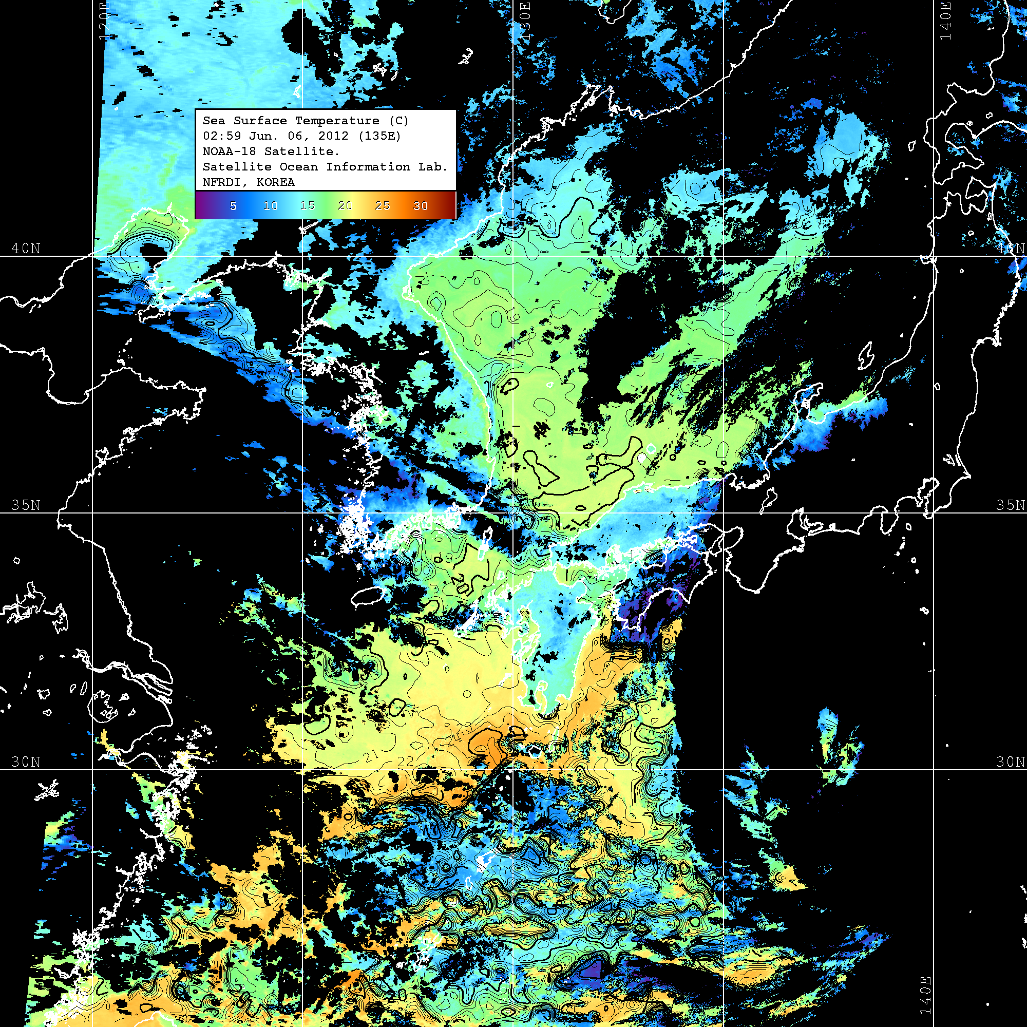 o 2012년 06월 06일 NOAA 위성영상입니다. o 영상 시간 및 수온분포는 범례를 참고하시기 바랍니다. o 검은색은 구름을 나타냅니다. o 그림을 클릭하시면 크게 보실 수 있습니다