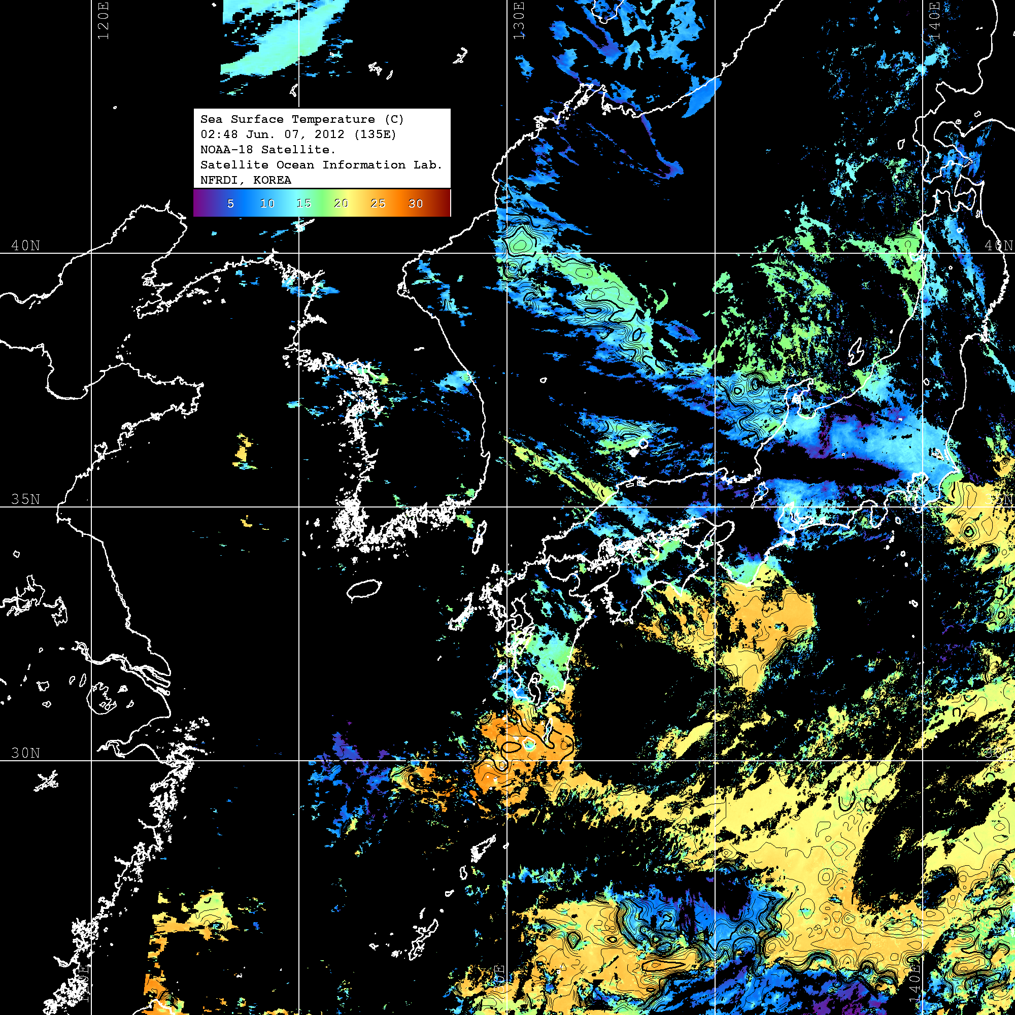 o 2012년 06월 07일 NOAA 위성영상입니다. o 영상 시간 및 수온분포는 범례를 참고하시기 바랍니다. o 검은색은 구름을 나타냅니다. o 그림을 클릭하시면 크게 보실 수 있습니다.