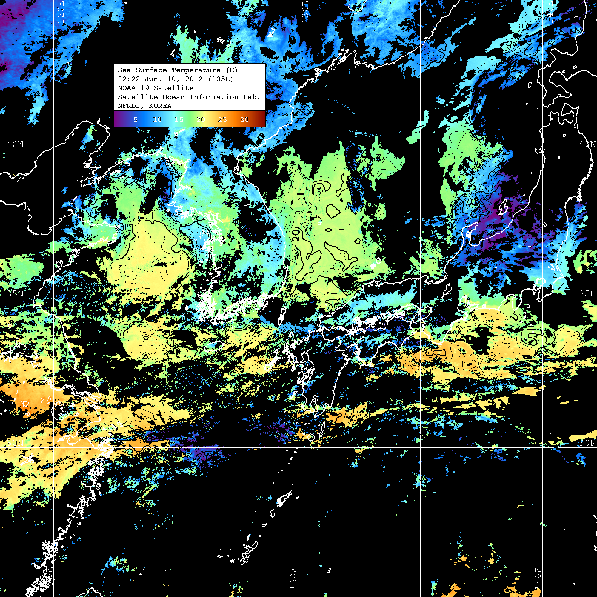 o 2012년 06월 10일 NOAA 위성영상입니다. o 영상 시간 및 수온분포는 범례를 참고하시기 바랍니다. o 검은색은 구름을 나타냅니다. o 그림을 클릭하시면 크게 보실 수 있습니다.