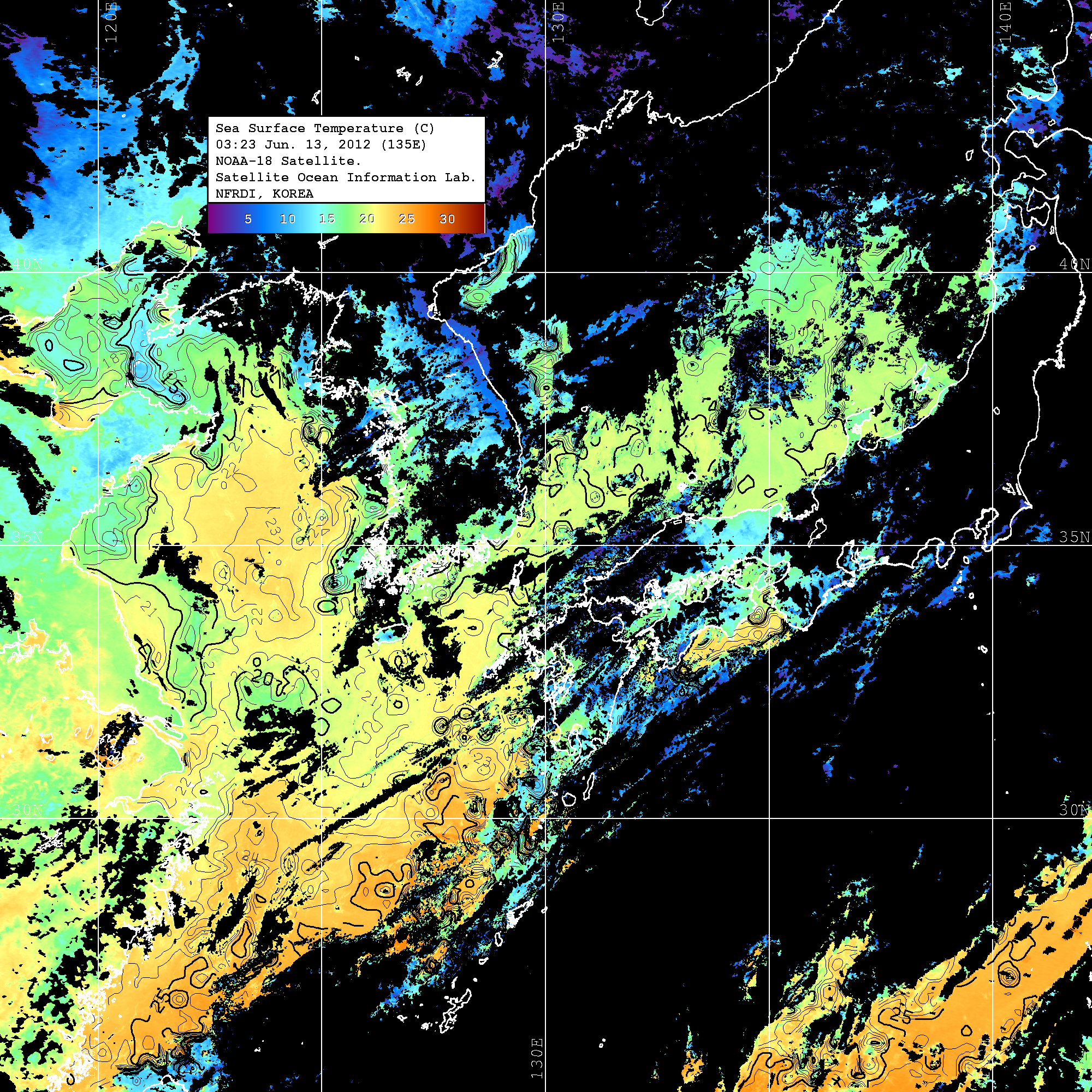 o 2012년 06월 13일 NOAA 위성영상입니다. o 영상 시간 및 수온분포는 범례를 참고하시기 바랍니다. o 검은색은 구름을 나타냅니다. o 그림을 클릭하시면 크게 보실 수 있습니다.