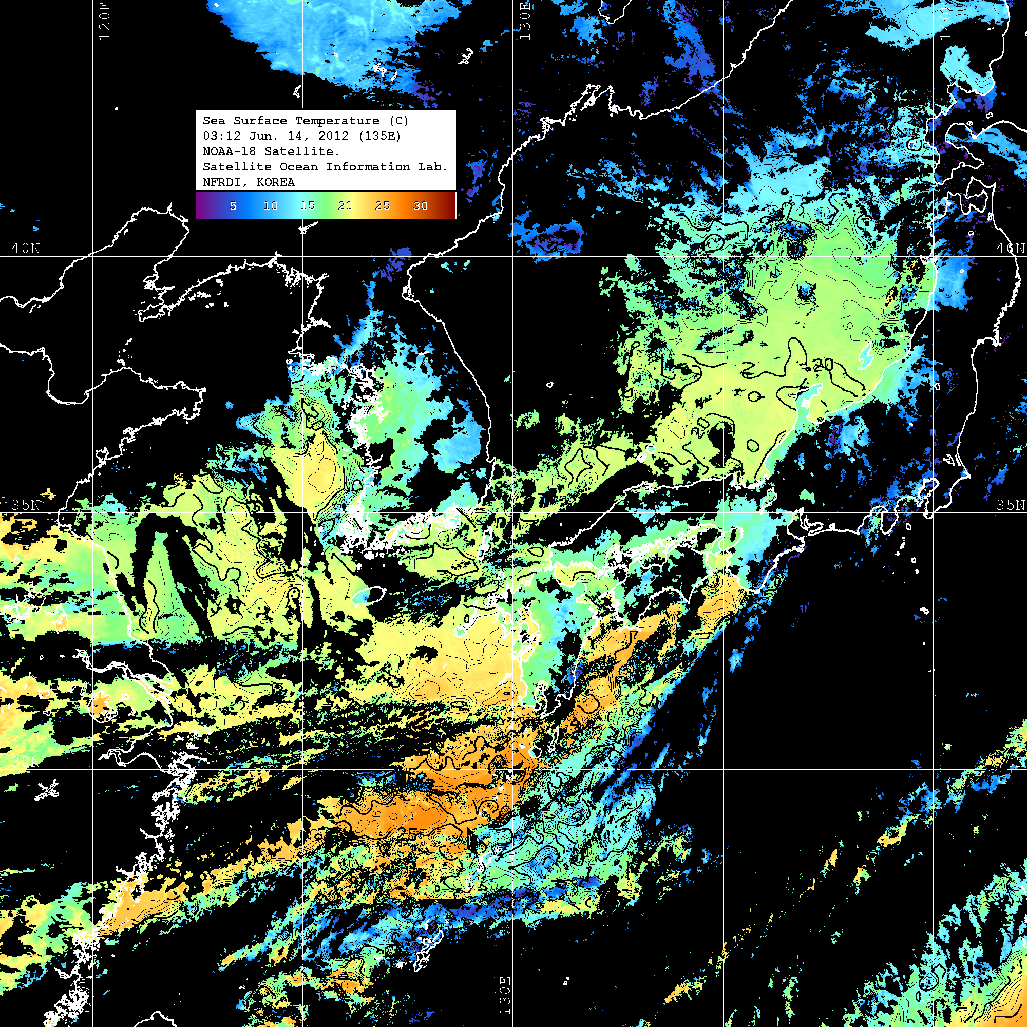 o 2012년 06월 14일 NOAA 위성영상입니다. o 영상 시간 및 수온분포는 범례를 참고하시기 바랍니다. o 검은색은 구름을 나타냅니다. o 그림을 클릭하시면 크게 보실 수 있습니다.