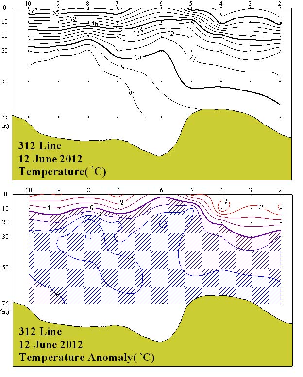 ㅇ 2012년 6월 12일 국립수산과학원 서해수산연구소에서 조사한 312선 (제주해협 서방)의 수직수온분포도 및 평년편차도입니다. ㅇ 표층부터 수심 30m 사이에서 수온약층이 형성 되었고, 정점 2~7에서는 상대적으로 약하게 형성되었습니다. ㅇ 평년에 비해 표층에서는 1~4℃ 내외의 고온현상을 나타났고, 수심 10m 이하 수층에서는 1~3℃ 내외의 저온현상을 나타내었습니다.