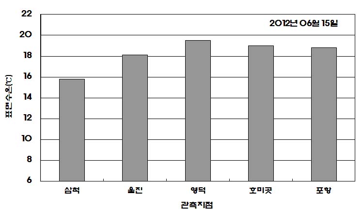 o 2012년 06월 15일 오후 3시를 기해 삼척 및 울진 연안 냉수대 주의보를 해제 합니다. o 2012년 06월 15일 오전 10시에 관측된 현장 표면수온은 삼척 15.8, 울진, 18.1, 영덕 19.5도, 호미곳 19도, 포항 18.8도로 나타납니다.(아래그림 참조) ※ 참고로 울기 연안 냉수대 주의보는 지난 2012년 6월 05일 발령하였으며, 삼척 연안 냉수대 주의보는 지난 2012년 6월 12일 발령하였습니다. o 냉수대 소멸시 수온 급상승에 따라 양식생물이 피해를 입을 수 있으니 주의하여 주시기 바랍니다. (http://www.nfrdi.re.kr/bbs?id=newfish) 에서도 이용하실 수 있습니다.