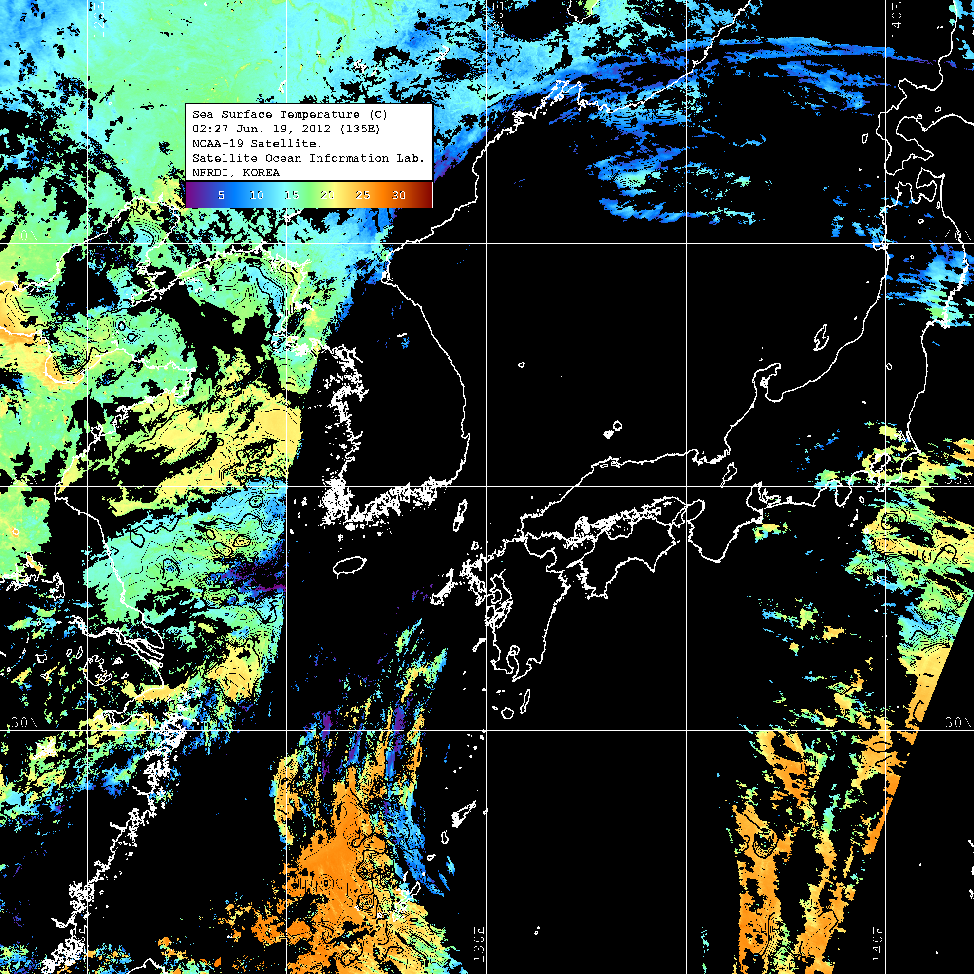 o 2012년 06월 19일 NOAA 위성영상입니다. o 영상 시간 및 수온분포는 범례를 참고하시기 바랍니다. o 검은색은 구름을 나타냅니다. o 그림을 클릭하시면 크게 보실 수 있습니다.