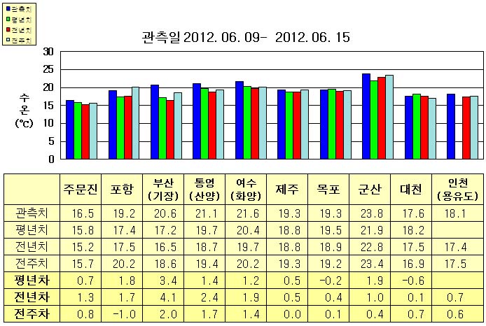 o 금주(2012.06.12~2012.06.18)의 한국근해 표면수온은 대화퇴 근해 18~19도, 울릉도 근해 19~20도, 대마도 근해 20~21도, 제주도 근해 21~22도, 이어도 근해 20~21도, 가거초 근해 20~21도, 어청도 근해 19~20도로 나타납니다. o 금주(2012.06.09~2012.06.15)의 한반도 연안 표면수온은 동해 연안역에서 섭씨 16.5~21.0도, 남해 연안역 19~22도, 서해 연안역에서 17.5~24.0도로 나타납니다. o 평년에 비해 동해 연안역은 0.5~3.5도 높게, 남해 연안역은 0.5∼1.5도 높게, 군산 1.9도 높음을 제외한 서해 연안역은 0.5∼1.0도 낮게 나타납니다. o 전년에 비해 동해 연안역은 1.0~4.5도 높게, 남해 연안역은 0.5∼2.5도 높게, 대천 비슷함을 제외한 서해 연안역은 0.5∼1.0도 높게 나타납니다.