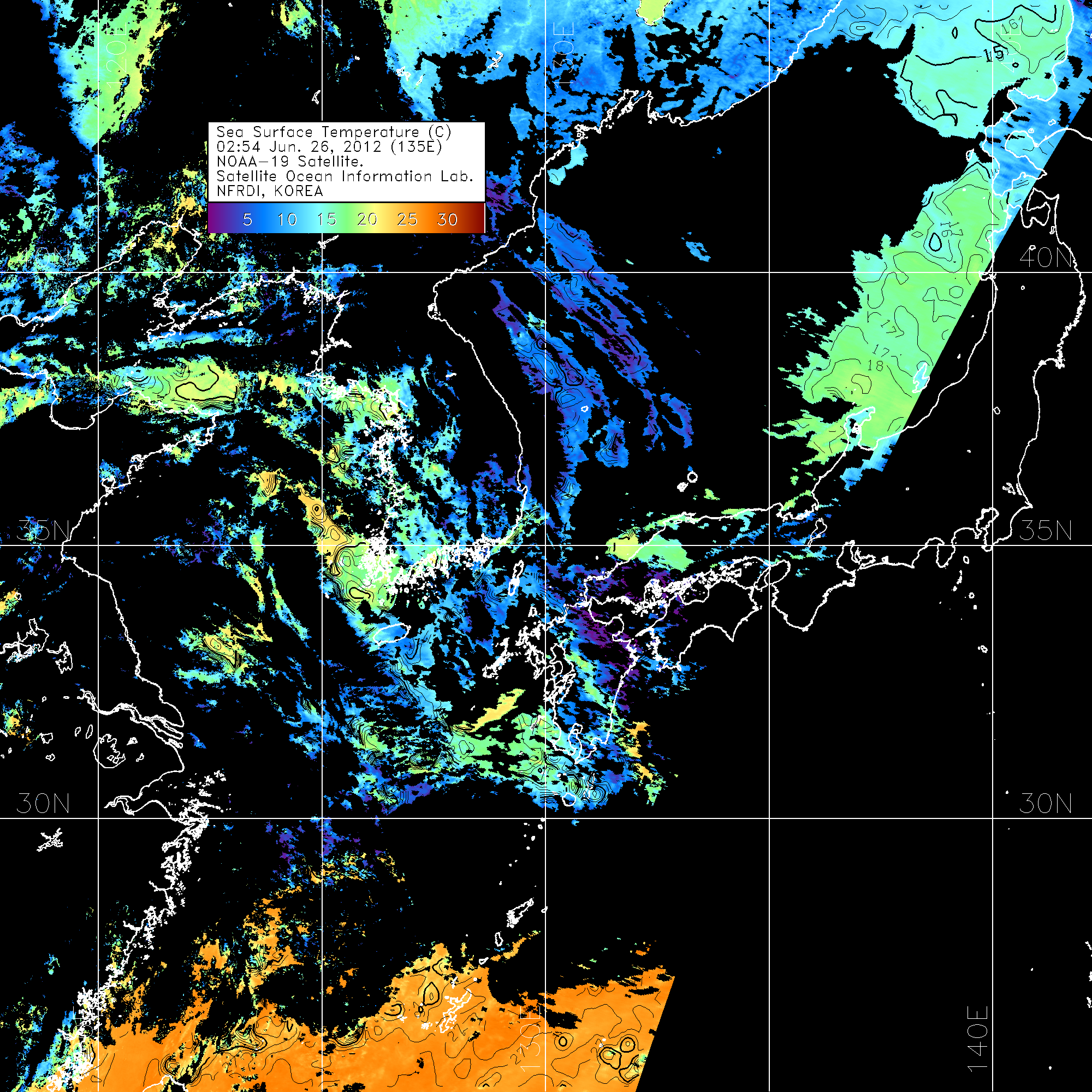 o 2012년 06월 26일 NOAA 위성영상입니다. o 영상 시간 및 수온분포는 범례를 참고하시기 바랍니다. o 검은색은 구름을 나타냅니다. o 그림을 클릭하시면 크게 보실 수 있습니다.
