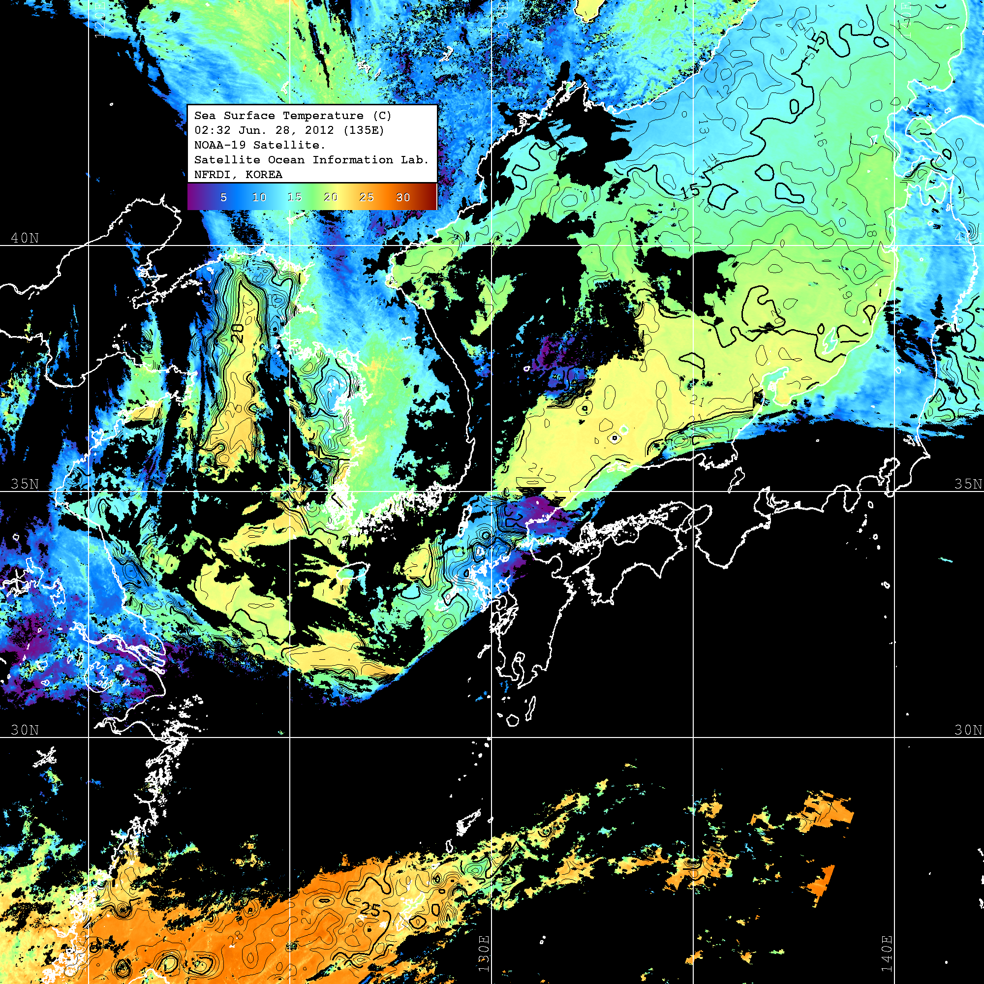 o 2012년 06월 28일 NOAA 위성영상입니다. o 영상 시간 및 수온분포는 범례를 참고하시기 바랍니다. o 검은색은 구름을 나타냅니다. o 그림을 클릭하시면 크게 보실 수 있습니다.