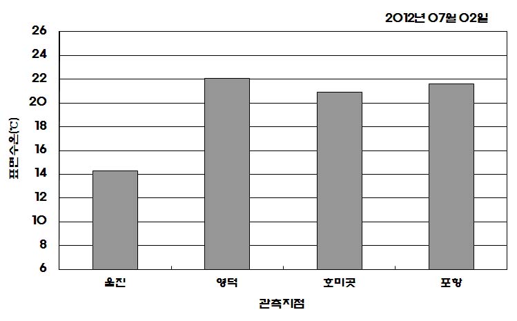 o 2012년 07월 02일 오후 2시를 기해 울진 연안 냉수대 주의보를 발령합니다. o 아래 그림은 2012년 07월 02일 오전 10시에 관측된 현장 표면수온 분포입니다. o 연안 관측 표면수온은 울진 14.3도, 영덕 22.1도, 호미곳 20.9도, 포항은 21.6도로 나타납니다. o 냉수대가 발생한 해역은 수온변동과 짙은 안개가 나타나고 있어 각별한 주의가 필요하며, 냉수대 대처법(해양자료속보, 제4111호)을 참고하시길 바랍니다. (http://www.nfrdi.re.kr/bbs?id=newfish) 에서도 이용하실 수 있습니다.