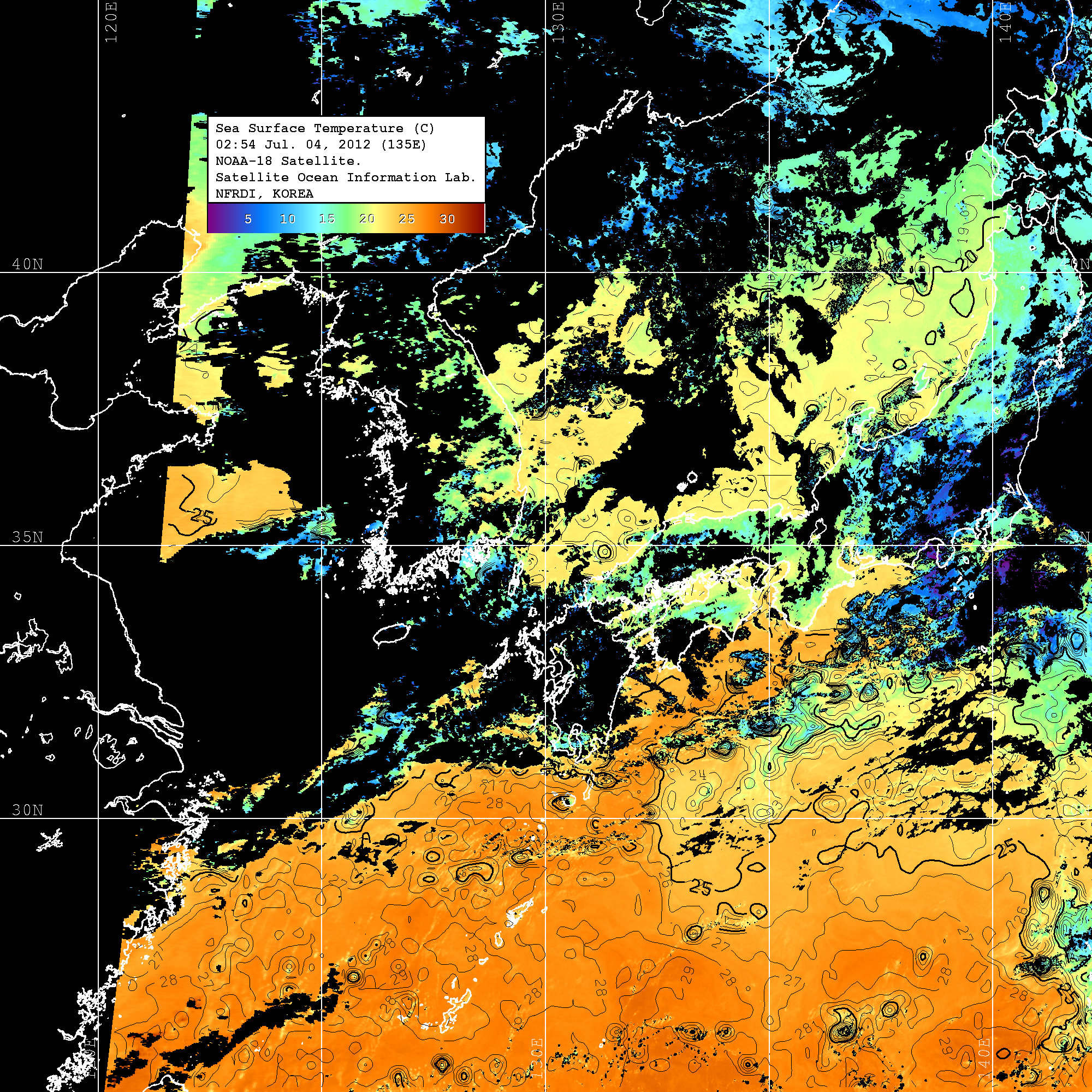 o 2012년 07월 04일 NOAA 위성영상입니다. o 영상 시간 및 수온분포는 범례를 참고하시기 바랍니다. o 검은색은 구름을 나타냅니다. o 그림을 클릭하시면 크게 보실 수 있습니다.