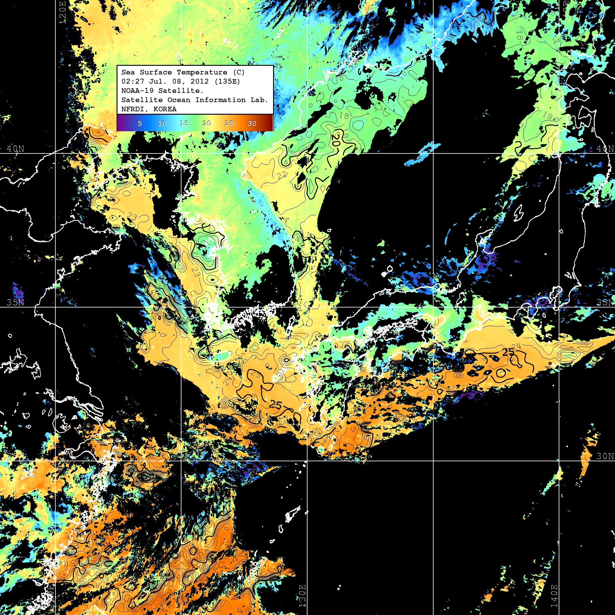 o 2012년 07월 08일 NOAA 위성영상입니다. o 영상 시간 및 수온분포는 범례를 참고하시기 바랍니다. o 검은색은 구름을 나타냅니다. o 그림을 클릭하시면 크게 보실 수 있습니다.