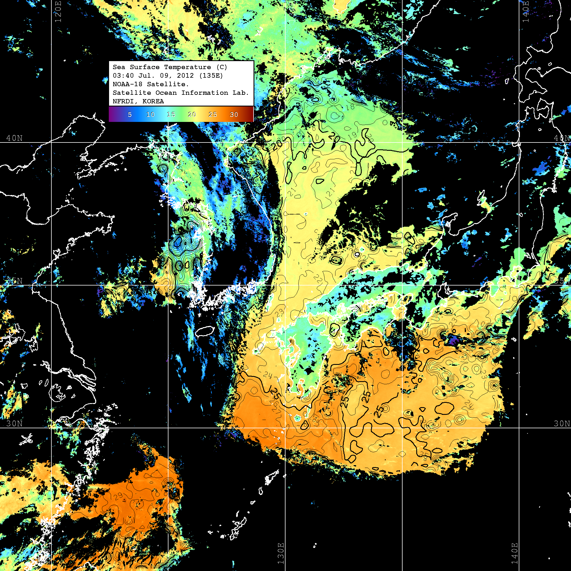 o 2012년 07월 09일 NOAA 위성영상입니다. o 영상 시간 및 수온분포는 범례를 참고하시기 바랍니다. o 검은색은 구름을 나타냅니다. o 그림을 클릭하시면 크게 보실 수 있습니다.