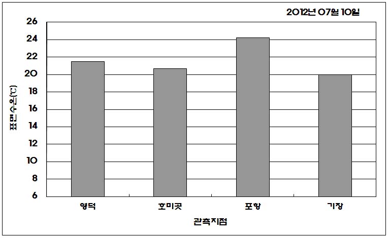 o 2012년 07월 10일 오후 2시를 기해 영덕 및 부산(기장) 연안 냉수대 주의보를 해제합니다. o 2012년 07월 10일 오전 10시에 관측된 현장 표면수온은 영덕 21.5도, 호미곳 20.7도, 포항 24.2도, 부산(기장) 20.0도로 나타납니다(아래그림 참조). o 2012년 07월 02일 발령한 울진 연안 냉수대 주의보(해양자료속보, 제4132호)는 현재 울진 연안 관측 표면수온이 17.8도로 나타나 유효합니다. o 냉수대 소멸시 수온 급상승에 따라 양식생물이 피해를 입을 수 있으니 주의하여 주시기 바랍니다. (http://www.nfrdi.re.kr/bbs?id=newfish) 에서도 이용하실 수 있습니다.